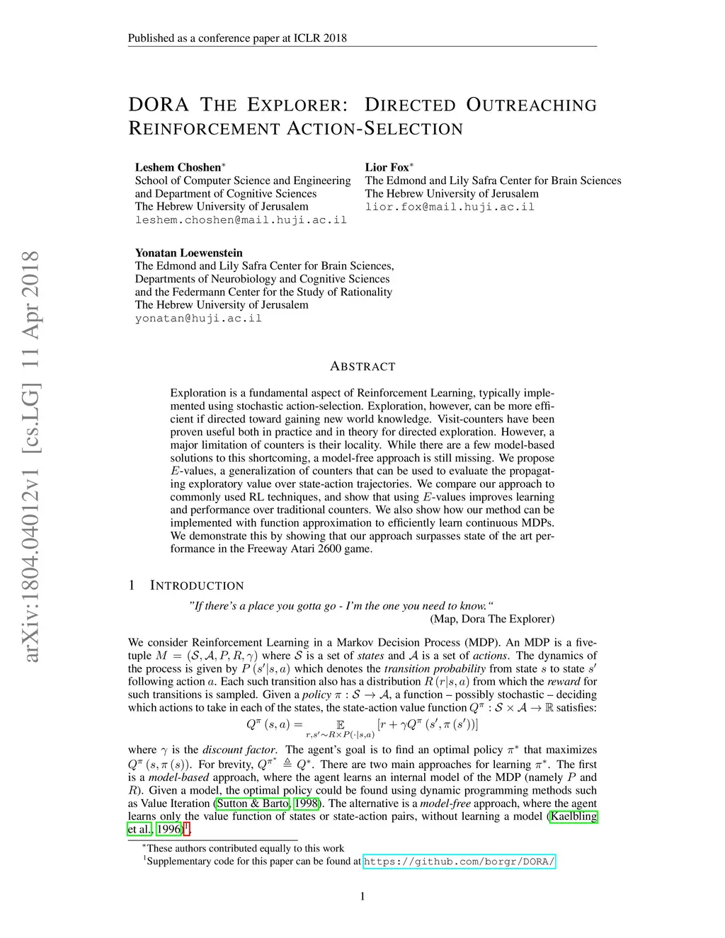 DORA The Explorer: Directed Outreaching Reinforcement Action-Selection