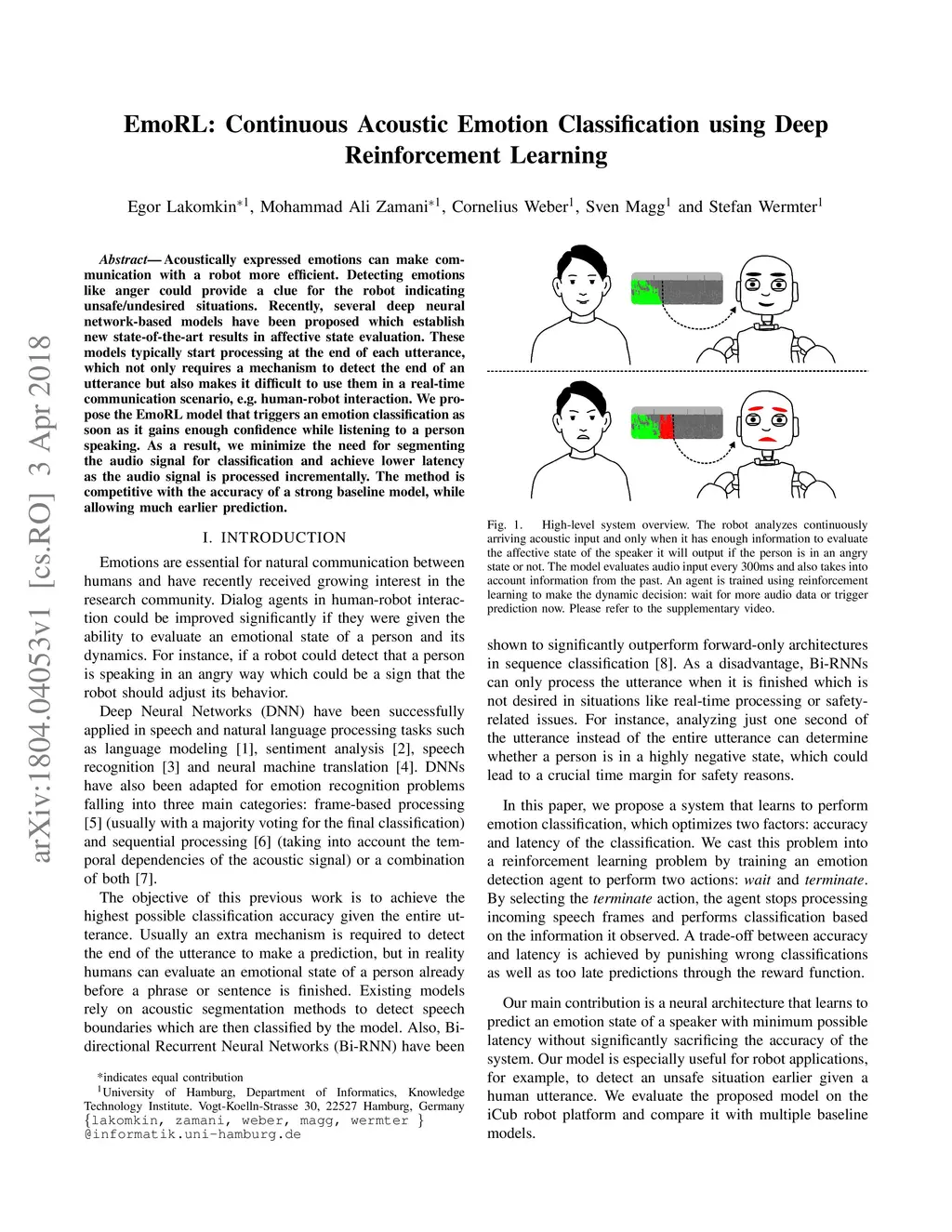 Acoustically expressed emotions can make communication with a robot more efficient. Detecting emotions like anger could provide a clue for the robot indicating unsafe/undesired situations. Recently, several deep neural network-based models have been proposed which establish new state-of-the-art results in affective state evaluation. These models typically start processing at the end of each utterance, which not only requires a mechanism to detect the end of an utterance but also makes it difficult to use them in a real-time communication scenario, e.g. human-robot interaction. We propose the EmoRL model that triggers an emotion classification as soon as it gains enough confidence while listening to a person speaking. As a result, we minimize the need for segmenting the audio signal for classification and achieve lower latency as the audio signal is processed incrementally. The method is competitive with the accuracy of a strong baseline model, while allowing much earlier prediction.
