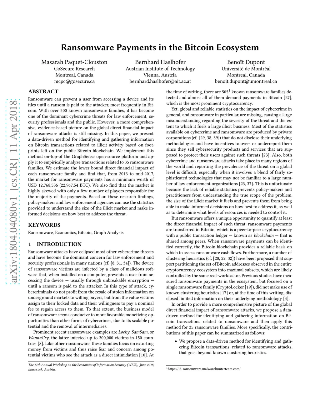 Ransomware can prevent a user from accessing a device and its files until a ransom is paid to the attacker, most frequently in Bitcoin. With over 500 known ransomware families, it has become one of the dominant cybercrime threats for law enforcement, security professionals and the public. However, a more comprehensive, evidence-based picture on the global direct financial impact of ransomware attacks is still missing. In this paper, we present a data-driven method for identifying and gathering information on Bitcoin transactions related to illicit activity based on footprints left on the public Bitcoin blockchain. We implement this method on-top-of the GraphSense open-source platform and apply it to empirically analyze transactions related to 35 ransomware families. We estimate the lower bound direct financial impact of each ransomware family and find that, from 2013 to mid-2017, the market for ransomware payments has a minimum worth of USD 12,768,536 (22,967.54 BTC). We also find that the market is highly skewed with only a few number of players responsible for the majority of the payments. Based on these research findings, policy-makers and law enforcement agencies can use the statistics provided to understand the size of the illicit market and make informed decisions on how best to address the threat.
