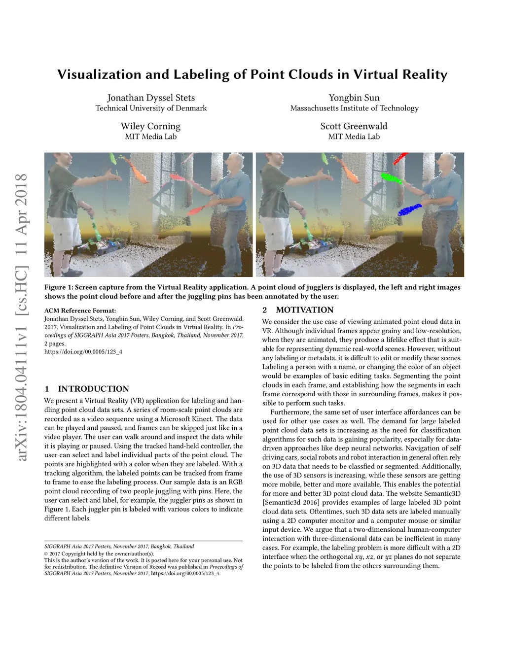 We present a Virtual Reality (VR) application for labeling and handling point cloud data sets. A series of room-scale point clouds are recorded as a video sequence using a Microsoft Kinect. The data can be played and paused, and frames can be skipped just like in a video player. The user can walk around and inspect the data while it is playing or paused. Using the tracked hand-held controller, the user can select and label individual parts of the point cloud. The points are highlighted with a color when they are labeled. With a tracking algorithm, the labeled points can be tracked from frame to frame to ease the labeling process. Our sample data is an RGB point cloud recording of two people juggling with pins. Here, the user can select and label, for example, the juggler pins as shown in Figure 1. Each juggler pin is labeled with various colors to indicate di erent labels.