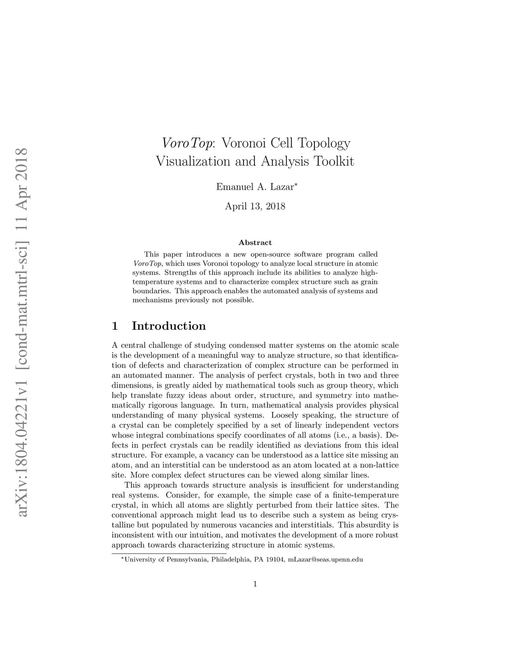 This paper introduces a new open-source software program called VoroTop, which uses Voronoi topology to analyze local structure in atomic systems. Strengths of this approach include its abilities to analyze high-temperature systems and to characterize complex structure such as grain boundaries. This approach enables the automated analysis of systems and mechanisms previously not possible.