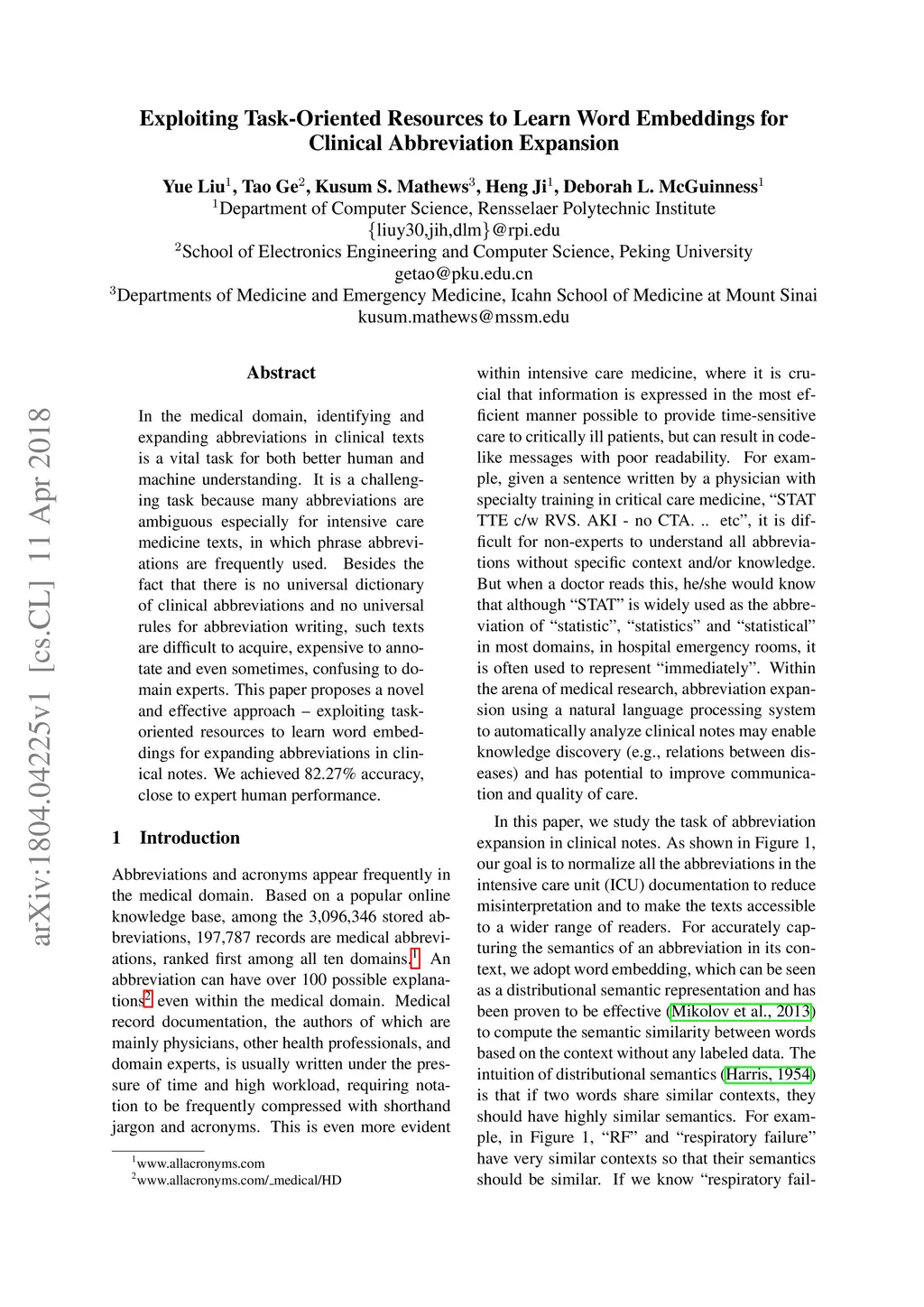 In the medical domain, identifying and expanding abbreviations in clinical texts is a vital task for both better human and machine understanding. It is a challenging task because many abbreviations are ambiguous especially for intensive care medicine texts, in which phrase abbreviations are frequently used. Besides the fact that there is no universal dictionary of clinical abbreviations and no universal rules for abbreviation writing, such texts are difficult to acquire, expensive to annotate and even sometimes, confusing to domain experts. This paper proposes a novel and effective approach - exploiting task-oriented resources to learn word embeddings for expanding abbreviations in clinical notes. We achieved 82.27% accuracy, close to expert human performance.