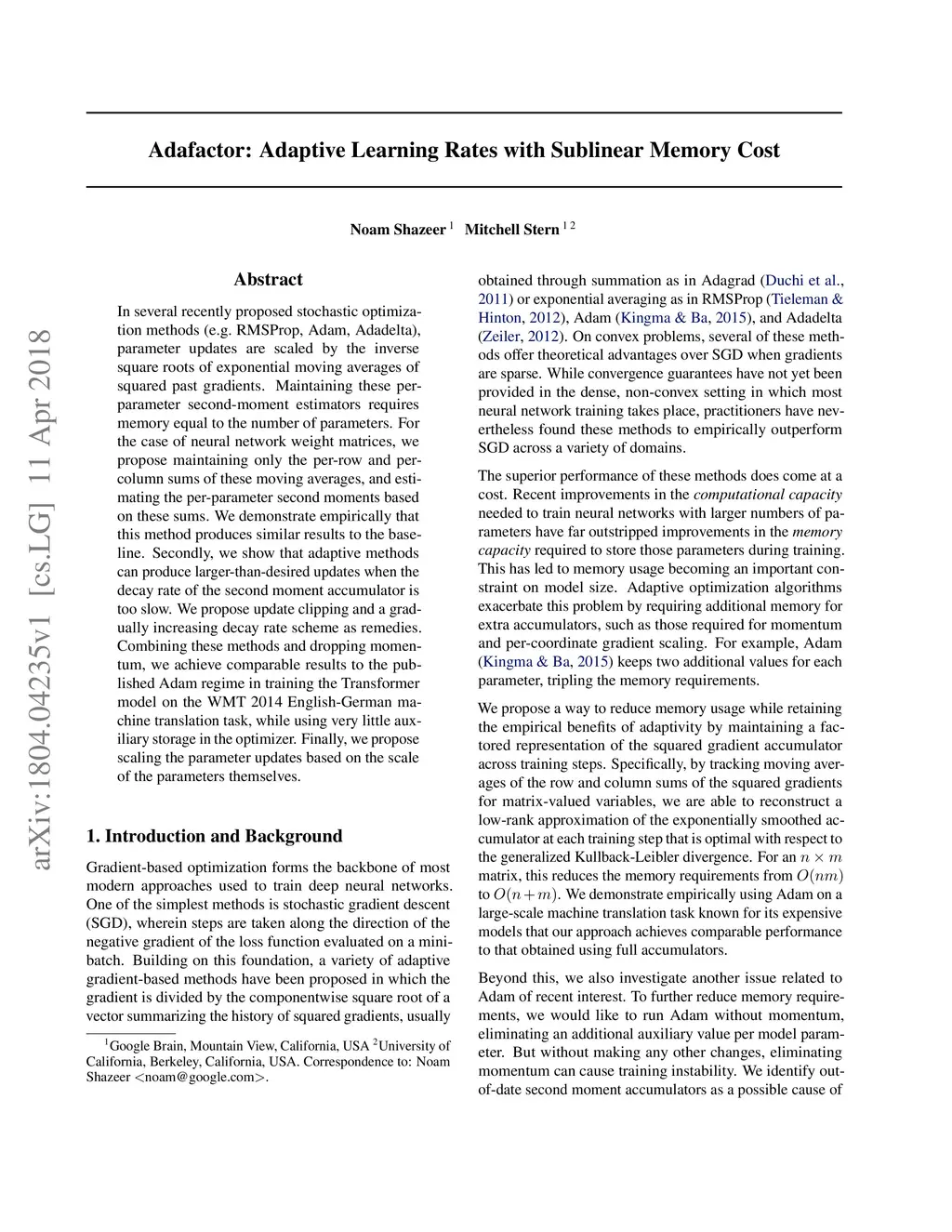 Adafactor: Adaptive Learning Rates with Sublinear Memory Cost