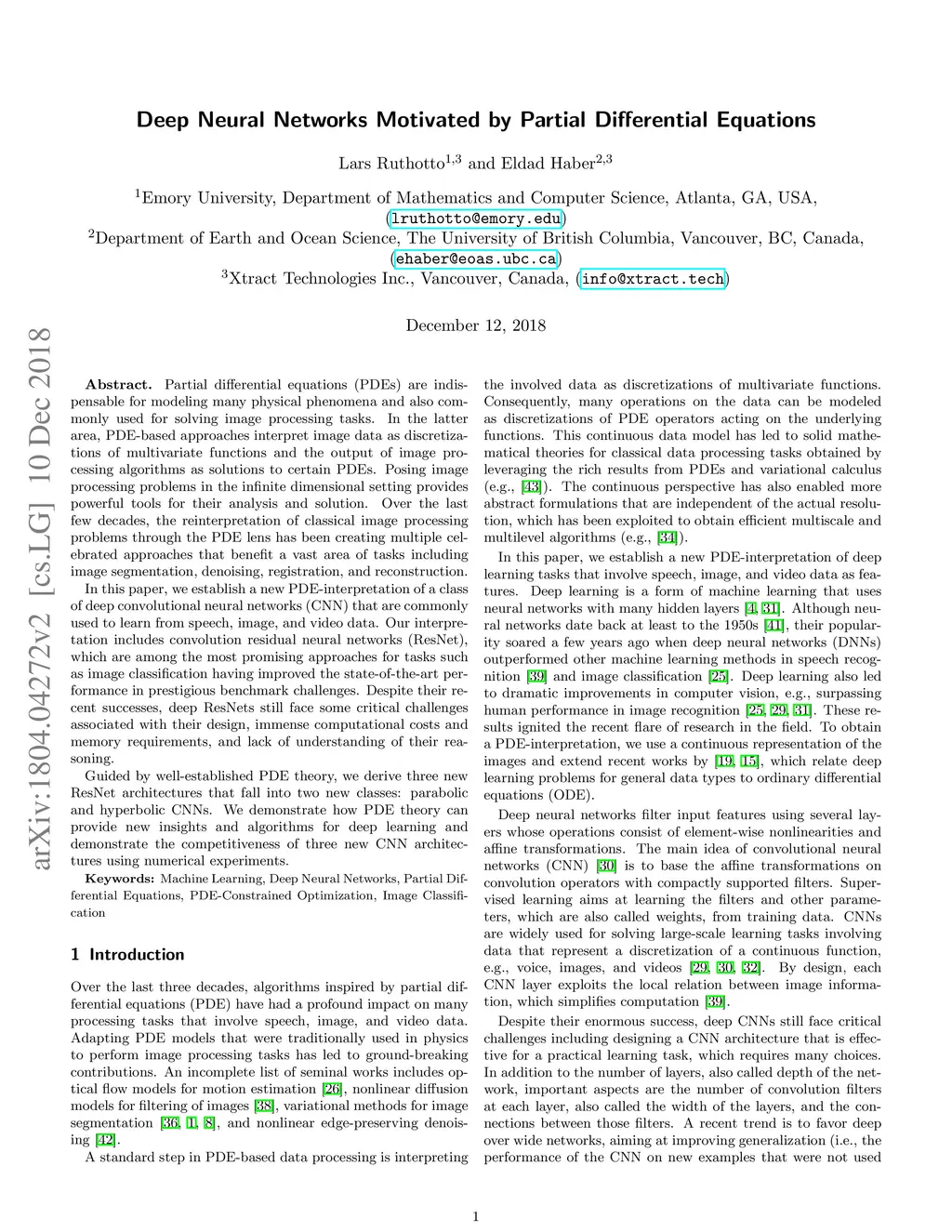 Partial differential equations (PDEs) are indispensable for modeling many physical phenomena and also commonly used for solving image processing tasks. In the latter area, PDE-based approaches interpret image data as discretizations of multivariate functions and the output of image processing algorithms as solutions to certain PDEs. Posing image processing problems in the infinite dimensional setting provides powerful tools for their analysis and solution. Over the last few decades, the reinterpretation of classical image processing problems through the PDE lens has been creating multiple celebrated approaches that benefit a vast area of tasks including image segmentation, denoising, registration, and reconstruction. In this paper, we establish a new PDE-interpretation of a class of deep convolutional neural networks (CNN) that are commonly used to learn from speech, image, and video data. Our interpretation includes convolution residual neural networks (ResNet), which are among the most promising approaches for tasks such as image classification having improved the state-of-the-art performance in prestigious benchmark challenges. Despite their recent successes, deep ResNets still face some critical challenges associated with their design, immense computational costs and memory requirements, and lack of understanding of their reasoning. Guided by well-established PDE theory, we derive three new ResNet architectures that fall into two new classes: parabolic and hyperbolic CNNs. We demonstrate how PDE theory can provide new insights and algorithms for deep learning and demonstrate the competitiveness of three new CNN architectures using numerical experiments.