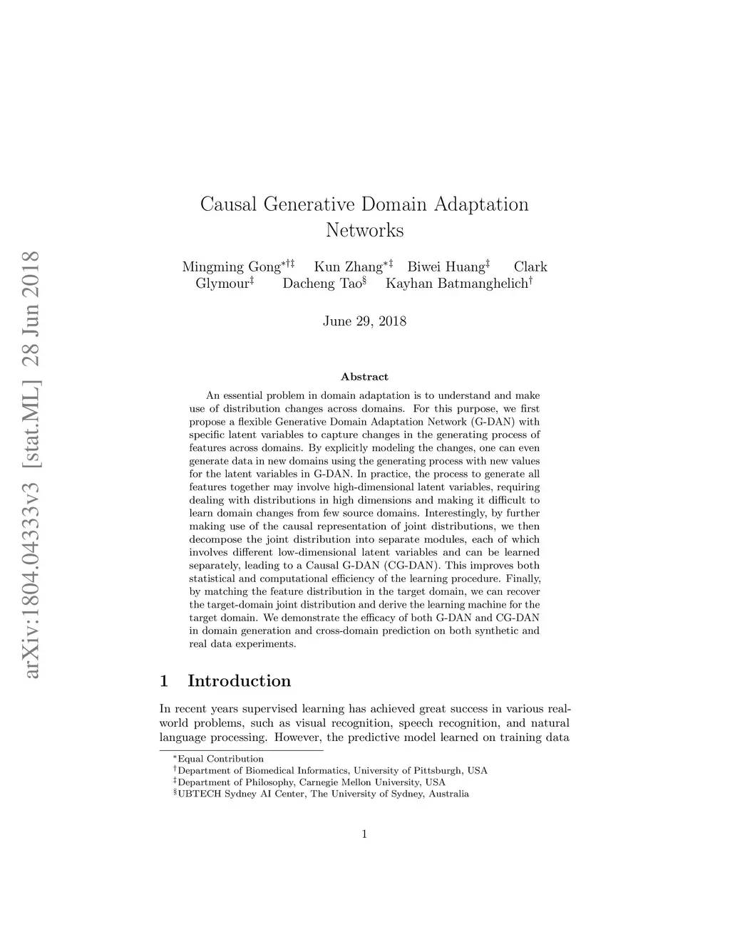 An essential problem in domain adaptation is to understand and make use of distribution changes across domains. For this purpose, we first propose a flexible Generative Domain Adaptation Network (G-DAN) with specific latent variables to capture changes in the generating process of features across domains. By explicitly modeling the changes, one can even generate data in new domains using the generating process with new values for the latent variables in G-DAN. In practice, the process to generate all features together may involve high-dimensional latent variables, requiring dealing with distributions in high dimensions and making it difficult to learn domain changes from few source domains. Interestingly, by further making use of the causal representation of joint distributions, we then decompose the joint distribution into separate modules, each of which involves different low-dimensional latent variables and can be learned separately, leading to a Causal G-DAN (CG-DAN). This improves both statistical and computational efficiency of the learning procedure. Finally, by matching the feature distribution in the target domain, we can recover the target-domain joint distribution and derive the learning machine for the target domain. We demonstrate the efficacy of both G-DAN and CG-DAN in domain generation and cross-domain prediction on both synthetic and real data experiments.