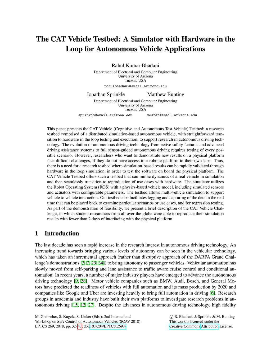 The CAT Vehicle Testbed: A Simulator with Hardware in the Loop for