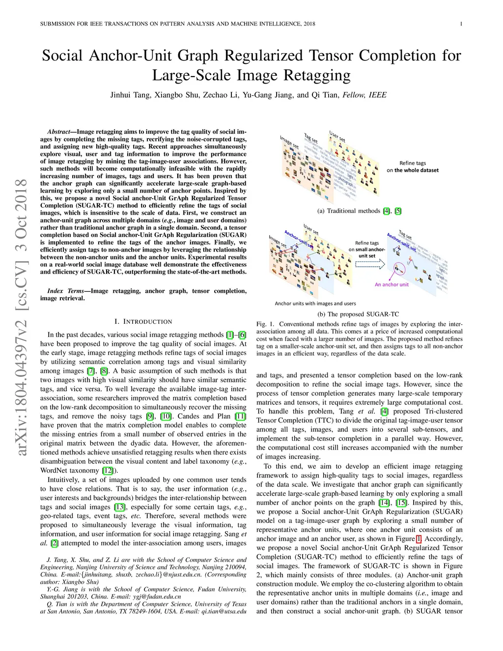 Image retagging aims to improve tag quality of social images by refining their original tags or assigning new high-quality tags. Recent approaches simultaneously explore visual, user and tag information to improve the performance of image retagging by constructing and exploring an image-tag-user graph. However, such methods will become computationally infeasible with the rapidly increasing number of images, tags and users. It has been proven that Anchor Graph Regularization (AGR) can significantly accelerate large-scale graph learning model by exploring only a small number of anchor points. Inspired by this, we propose a novel Social anchor-Unit GrAph Regularized Tensor Completion (SUGAR-TC) method to effectively refine the tags of social images, which is insensitive to the scale of the applied data. First, we construct an anchor-unit graph across multiple domains (e.g., image and user domains) rather than traditional anchor graph in a single domain. Second, a tensor completion based on SUGAR is implemented on the original image-tag-user tensor to refine the tags of the anchor images. Third, we efficiently assign tags to non-anchor images by leveraging the relationship between the non-anchor images and the anchor units. Experimental results on a real-world social image database well demonstrate the effectiveness of SUGAR-TC, outperforming several related methods.