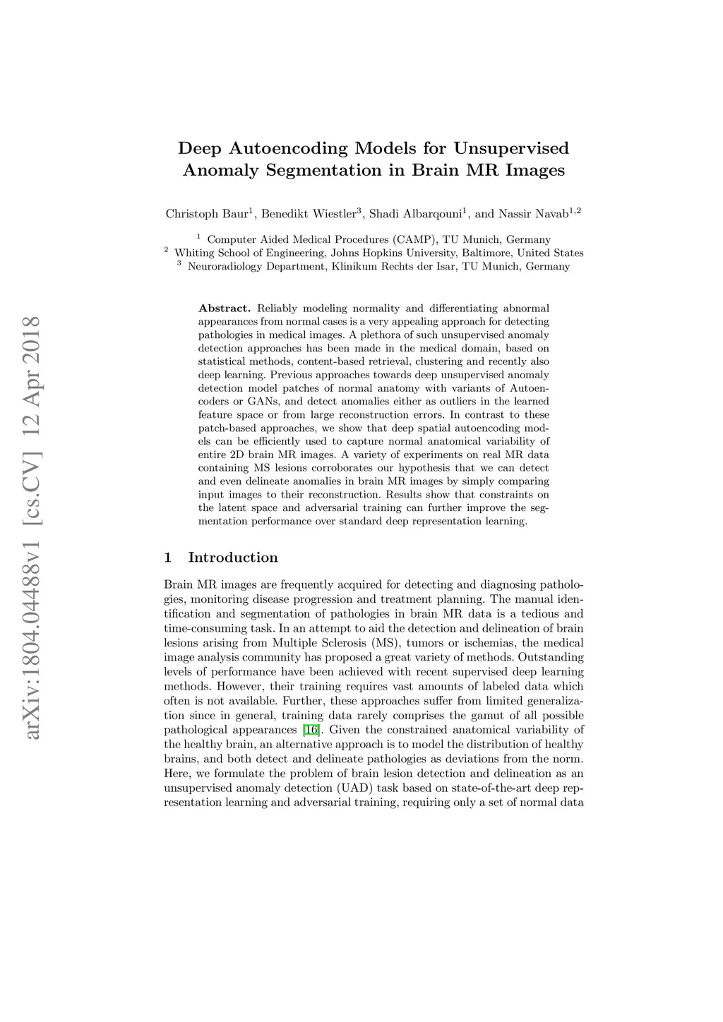 Reliably modeling normality and differentiating abnormal appearances from normal cases is a very appealing approach for detecting pathologies in medical images. A plethora of such unsupervised anomaly detection approaches has been made in the medical domain, based on statistical methods, content-based retrieval, clustering and recently also deep learning. Previous approaches towards deep unsupervised anomaly detection model patches of normal anatomy with variants of Autoencoders or GANs, and detect anomalies either as outliers in the learned feature space or from large reconstruction errors. In contrast to these patch-based approaches, we show that deep spatial autoencoding models can be efficiently used to capture normal anatomical variability of entire 2D brain MR images. A variety of experiments on real MR data containing MS lesions corroborates our hypothesis that we can detect and even delineate anomalies in brain MR images by simply comparing input images to their reconstruction. Results show that constraints on the latent space and adversarial training can further improve the segmentation performance over standard deep representation learning.