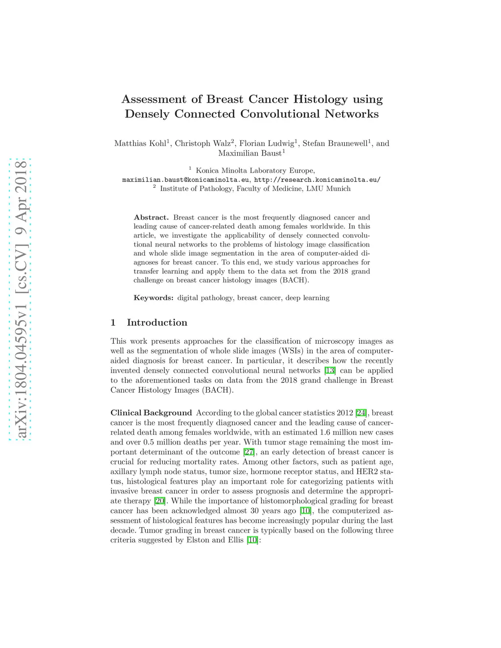 Breast cancer is the most frequently diagnosed cancer and leading cause of cancer-related death among females worldwide. In this article, we investigate the applicability of densely connected convolutional neural networks to the problems of histology image classification and whole slide image segmentation in the area of computer-aided diagnoses for breast cancer. To this end, we study various approaches for transfer learning and apply them to the data set from the 2018 grand challenge on breast cancer histology images (BACH).