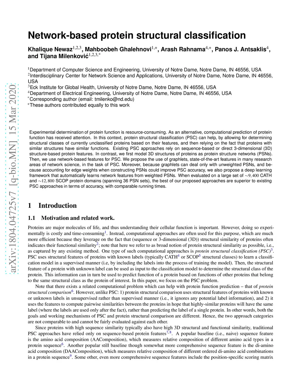 Experimental determination of protein function is resource-consuming. As an alternative, computational prediction of protein function has received attention. In this context, protein structural classification (PSC) can help, by allowing for determining structural classes of currently unclassified proteins based on their features, and then relying on the fact that proteins with similar structures have similar functions. Existing PSC approaches rely on sequence-based or direct 3-dimensional (3D) structure-based protein features. In contrast, we first model 3D structures of proteins as protein structure networks (PSNs). Then, we use network-based features for PSC. We propose the use of graphlets, state-of-the-art features in many research areas of network science, in the task of PSC. Moreover, because graphlets can deal only with unweighted PSNs, and because accounting for edge weights when constructing PSNs could improve PSC accuracy, we also propose a deep learning framework that automatically learns network features from weighted PSNs. When evaluated on a large set of ~9,400 CATH and ~12,800 SCOP protein domains (spanning 36 PSN sets), our proposed approaches are superior to existing PSC approaches in terms of accuracy, with comparable running time.