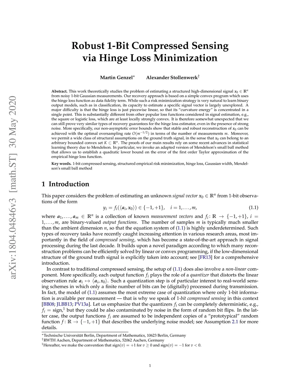 Robust 1-Bit Compressed Sensing via Hinge Loss Minimization