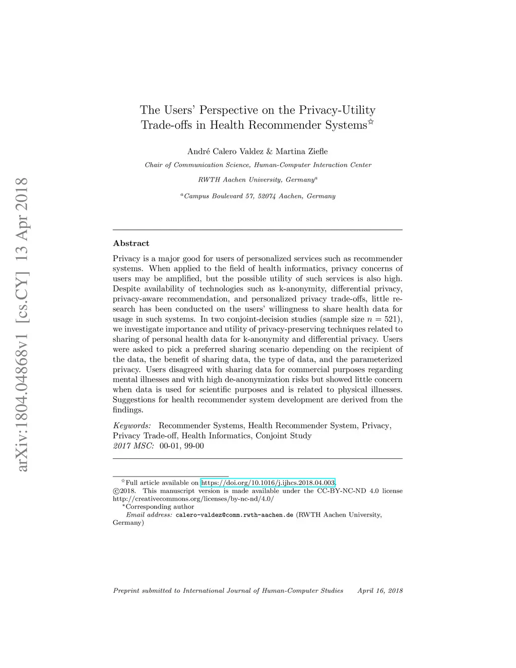 Privacy is a major good for users of personalized services such as recommender systems. When applied to the field of health informatics, privacy concerns of users may be amplified, but the possible utility of such services is also high. Despite availability of technologies such as k-anonymity, differential privacy, privacy-aware recommendation, and personalized privacy trade-offs, little research has been conducted on the users' willingness to share health data for usage in such systems. In two conjoint-decision studies (sample size n=521), we investigate importance and utility of privacy-preserving techniques related to sharing of personal health data for k-anonymity and differential privacy. Users were asked to pick a preferred sharing scenario depending on the recipient of the data, the benefit of sharing data, the type of data, and the parameterized privacy. Users disagreed with sharing data for commercial purposes regarding mental illnesses and with high de-anonymization risks but showed little concern when data is used for scientific purposes and is related to physical illnesses. Suggestions for health recommender system development are derived from the findings.