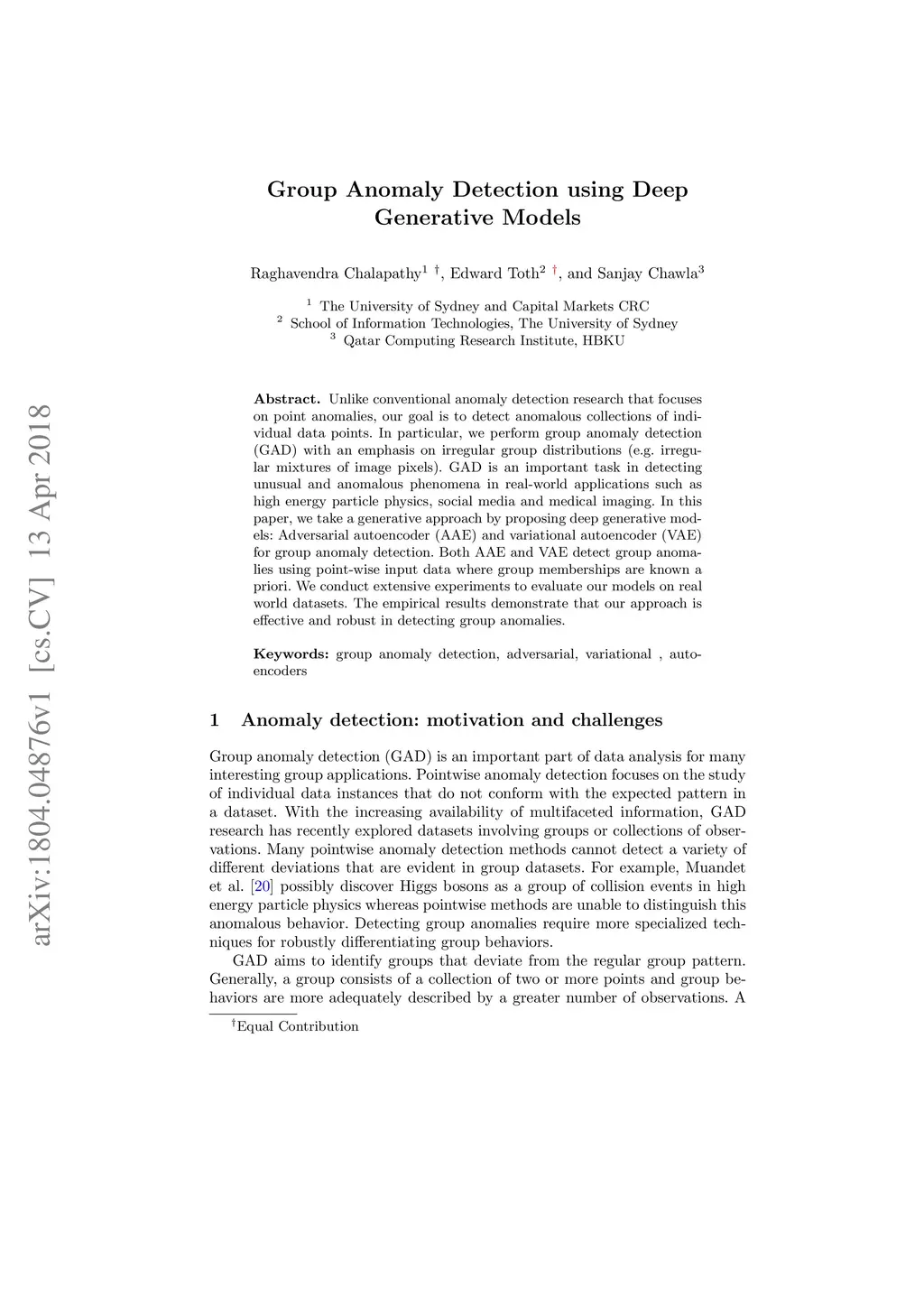 Unlike conventional anomaly detection research that focuses on point anomalies, our goal is to detect anomalous collections of individual data points. In particular, we perform group anomaly detection (GAD) with an emphasis on irregular group distributions (e.g. irregular mixtures of image pixels). GAD is an important task in detecting unusual and anomalous phenomena in real-world applications such as high energy particle physics, social media, and medical imaging. In this paper, we take a generative approach by proposing deep generative models: Adversarial autoencoder (AAE) and variational autoencoder (VAE) for group anomaly detection. Both AAE and VAE detect group anomalies using point-wise input data where group memberships are known a priori. We conduct extensive experiments to evaluate our models on real-world datasets. The empirical results demonstrate that our approach is effective and robust in detecting group anomalies.