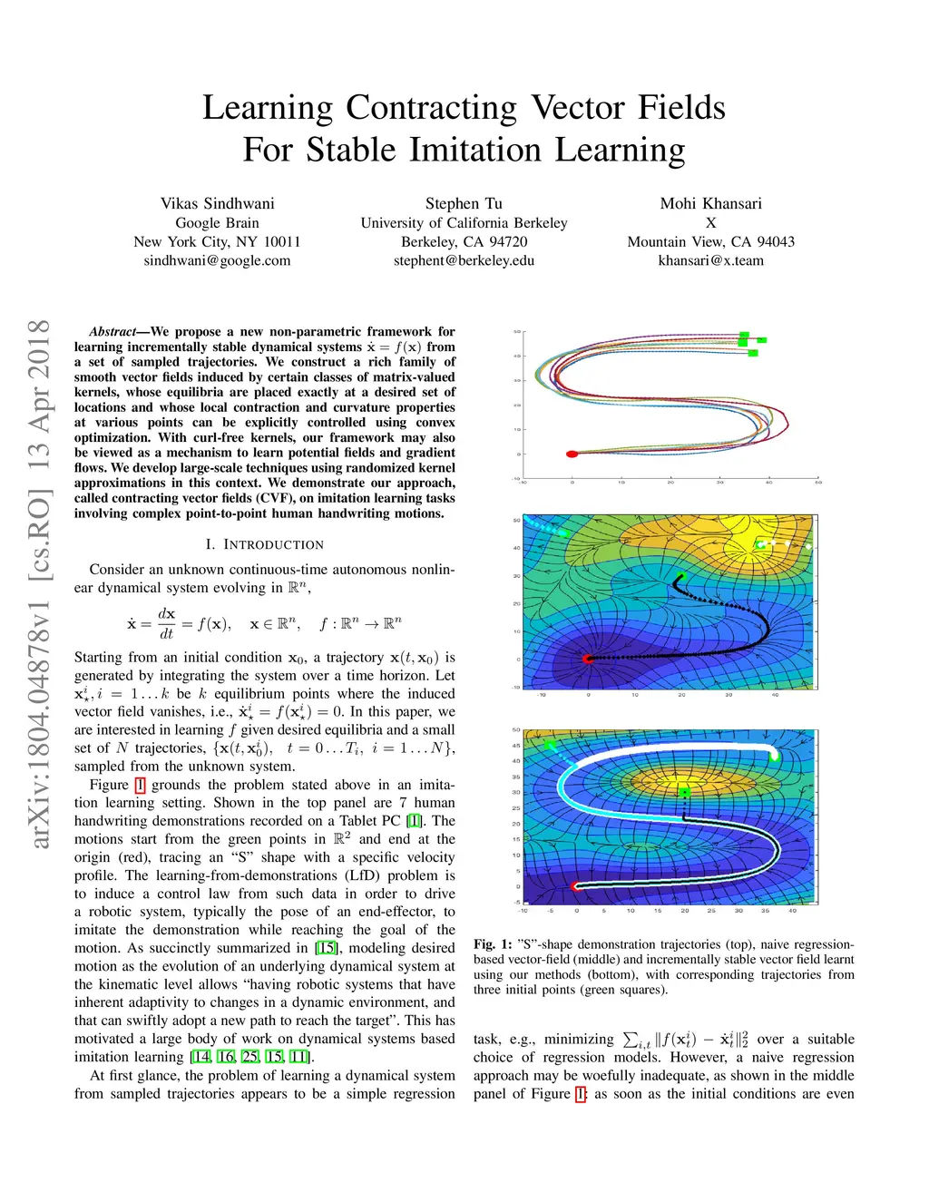 We propose a new non-parametric framework for learning incrementally stable dynamical systems x' = f(x) from a set of sampled trajectories. We construct a rich family of smooth vector fields induced by certain classes of matrix-valued kernels, whose equilibria are placed exactly at a desired set of locations and whose local contraction and curvature properties at various points can be explicitly controlled using convex optimization. With curl-free kernels, our framework may also be viewed as a mechanism to learn potential fields and gradient flows. We develop large-scale techniques using randomized kernel approximations in this context. We demonstrate our approach, called contracting vector fields (CVF), on imitation learning tasks involving complex point-to-point human handwriting motions.