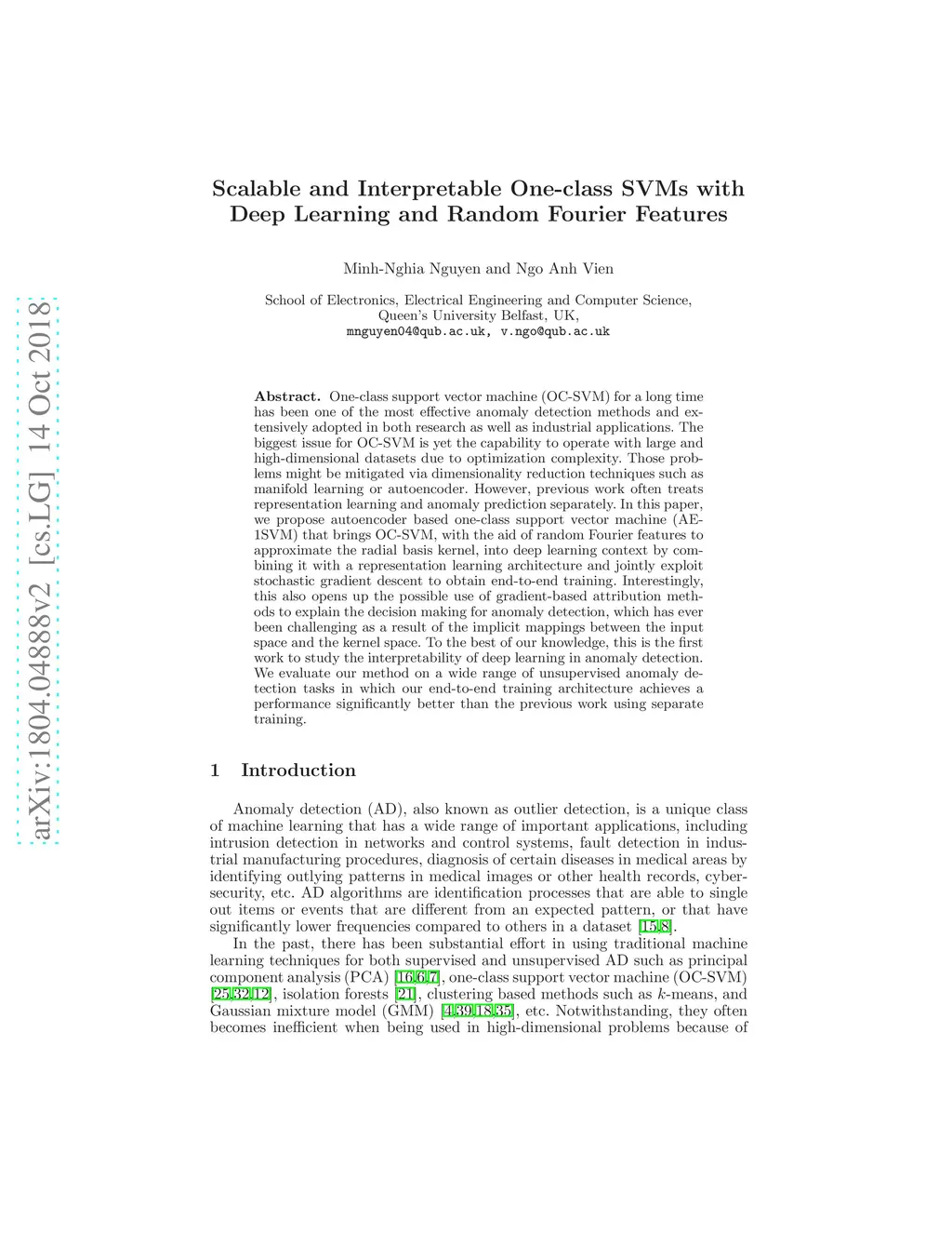 One-class support vector machine (OC-SVM) for a long time has been one of the most effective anomaly detection methods and extensively adopted in both research as well as industrial applications. The biggest issue for OC-SVM is yet the capability to operate with large and high-dimensional datasets due to optimization complexity. Those problems might be mitigated via dimensionality reduction techniques such as manifold learning or autoencoder. However, previous work often treats representation learning and anomaly prediction separately. In this paper, we propose autoencoder based one-class support vector machine (AE-1SVM) that brings OC-SVM, with the aid of random Fourier features to approximate the radial basis kernel, into deep learning context by combining it with a representation learning architecture and jointly exploit stochastic gradient descent to obtain end-to-end training. Interestingly, this also opens up the possible use of gradient-based attribution methods to explain the decision making for anomaly detection, which has ever been challenging as a result of the implicit mappings between the input space and the kernel space. To the best of our knowledge, this is the first work to study the interpretability of deep learning in anomaly detection. We evaluate our method on a wide range of unsupervised anomaly detection tasks in which our end-to-end training architecture achieves a performance significantly better than the previous work using separate training.