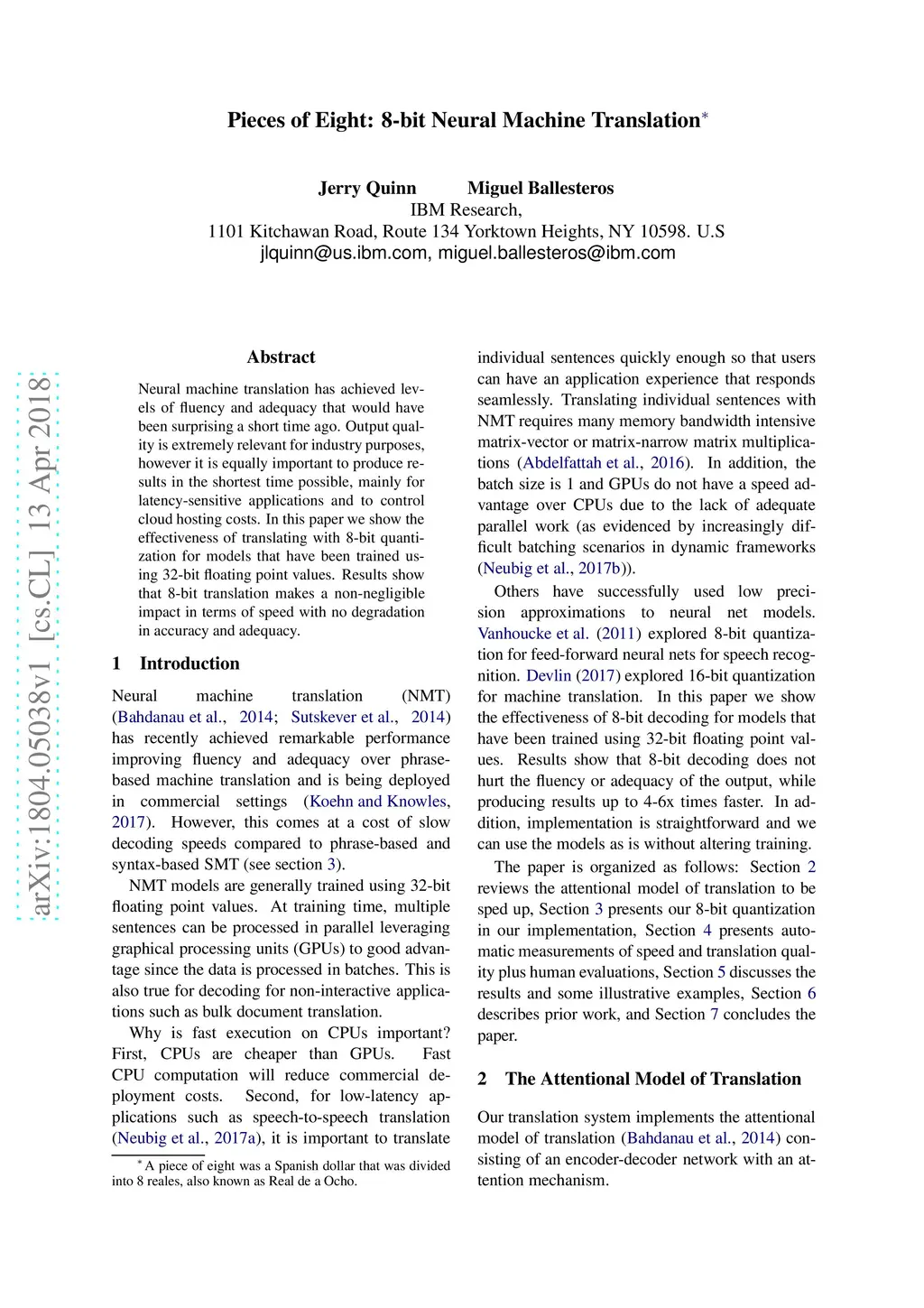 Neural machine translation has achieved levels of fluency and adequacy that would have been surprising a short time ago. Output quality is extremely relevant for industry purposes, however it is equally important to produce results in the shortest time possible, mainly for latency-sensitive applications and to control cloud hosting costs. In this paper we show the effectiveness of translating with 8-bit quantization for models that have been trained using 32-bit floating point values. Results show that 8-bit translation makes a non-negligible impact in terms of speed with no degradation in accuracy and adequacy.