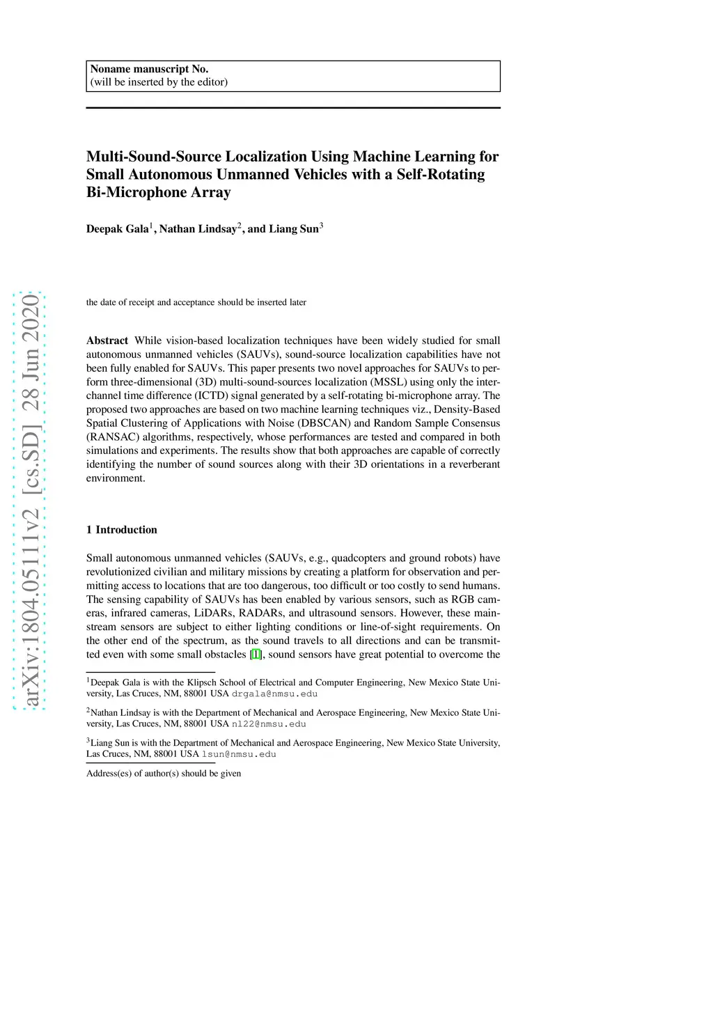 Abstract While vision-based localization techniques have been widely studied for small autonomous unmanned vehicles (SAUVs), sound-source localization capabilities have not been fully enabled for SAUVs. This paper presents two novel approaches for SAUVs to perform three-dimensional (3D) multi-sound-sources localization (MSSL) using only the inter-channel time difference (ICTD) signal generated by a self-rotating bi-microphone array. The proposed two approaches are based on two machine learning techniques viz., Density-Based Spatial Clustering of Applications with Noise (DBSCAN) and Random Sample Consensus (RANSAC) algorithms, respectively, whose performances are tested and compared in both simulations and experiments. The results show that both approaches are capable of correctly identifying the number of sound sources along with their 3D orientations in a reverberant environment.