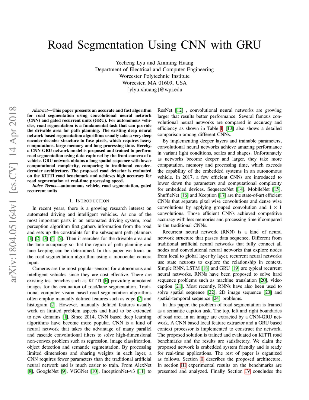 This paper presents an accurate and fast algorithm for road segmentation using convolutional neural network (CNN) and gated recurrent units (GRU). For autonomous vehicles, road segmentation is a fundamental task that can provide the drivable area for path planning. The existing deep neural network based segmentation algorithms usually take a very deep encoder-decoder structure to fuse pixels, which requires heavy computations, large memory and long processing time. Hereby, a CNN-GRU network model is proposed and trained to perform road segmentation using data captured by the front camera of a vehicle. GRU network obtains a long spatial sequence with lower computational complexity, comparing to traditional encoder-decoder architecture. The proposed road detector is evaluated on the KITTI road benchmark and achieves high accuracy for road segmentation at real-time processing speed.