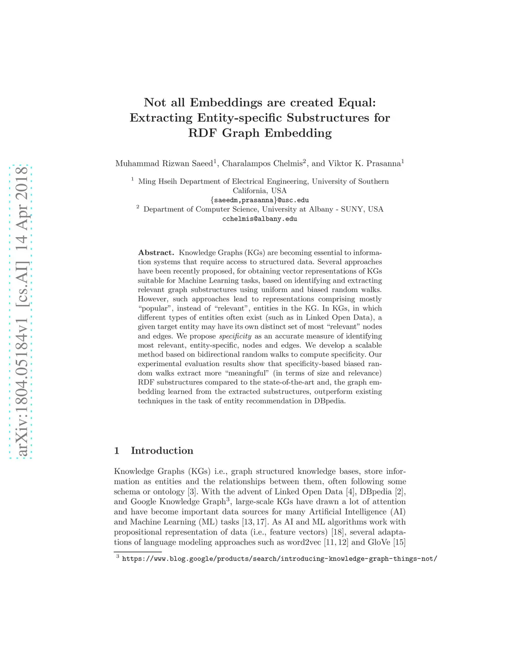 Knowledge Graphs (KGs) are becoming essential to information systems that require access to structured data. Several approaches have been recently proposed, for obtaining vector representations of KGs suitable for Machine Learning tasks, based on identifying and extracting relevant graph substructures using uniform and biased random walks. However, such approaches lead to representations comprising mostly "popular", instead of "relevant", entities in the KG. In KGs, in which different types of entities often exist (such as in Linked Open Data), a given target entity may have its own distinct set of most "relevant" nodes and edges. We propose specificity as an accurate measure of identifying most relevant, entity-specific, nodes and edges. We develop a scalable method based on bidirectional random walks to compute specificity. Our experimental evaluation results show that specificity-based biased random walks extract more "meaningful" (in terms of size and relevance) RDF substructures compared to the state-of-the-art and, the graph embedding learned from the extracted substructures, outperform existing techniques in the task of entity recommendation in DBpedia.