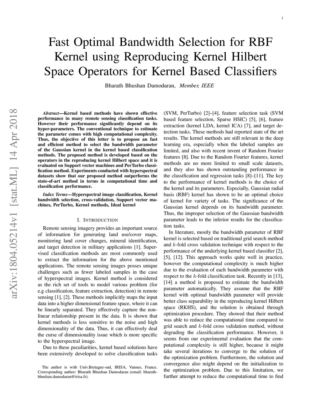 Kernel based methods have shown effective performance in many remote sensing classification tasks. However their performance significantly depend on its hyper-parameters. The conventional technique to estimate the parameter comes with high computational complexity. Thus, the objective of this letter is to propose an fast and efficient method to select the bandwidth parameter of the Gaussian kernel in the kernel based classification methods. The proposed method is developed based on the operators in the reproducing kernel Hilbert space and it is evaluated on Support vector machines and PerTurbo classification method. Experiments conducted with hyperspectral datasets show that our proposed method outperforms the state-of-art method in terms in computational time and classification performance.