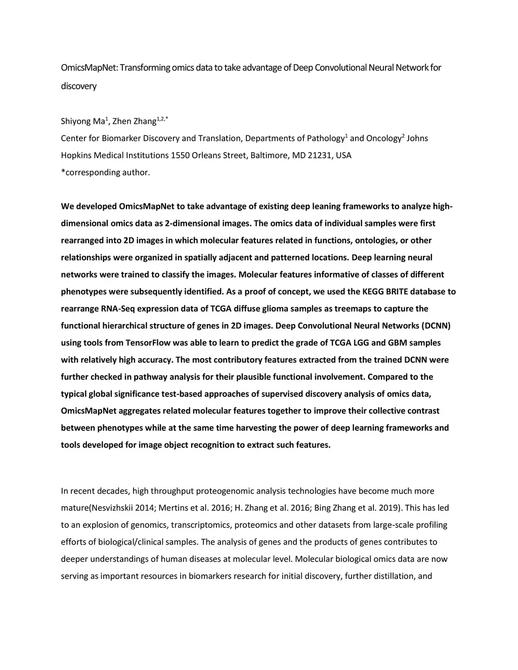 We developed OmicsMapNet approach to take advantage of existing deep leaning frameworks to analyze high-dimensional omics data as 2-dimensional images. The omics data of individual samples were first rearranged into 2D images in which molecular features related in functions, ontologies, or other relationships were organized in spatially adjacent and patterned locations. Deep learning neural networks were trained to classify the images. Molecular features informative of classes of different phenotypes were subsequently identified. As an example, we used the KEGG BRITE database to rearrange RNA-Seq expression data of TCGA diffuse glioma samples as treemaps to capture the functional hierarchical structure of genes in 2D images. Deep Convolutional Neural Networks (CNN) were derived using tools from TensorFlow to learn the grade of TCGA LGG and GBM samples with relatively high accuracy. The most contributory features in the trained CNN were confirmed in pathway analysis for their plausible functional involvement.
