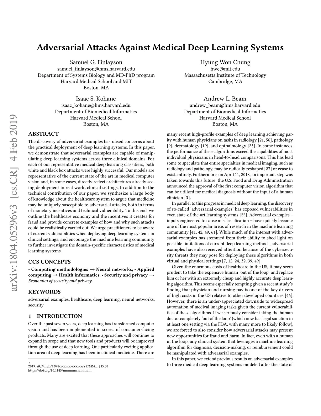The discovery of adversarial examples has raised concerns about the practical deployment of deep learning systems. In this paper, we demonstrate that adversarial examples are capable of manipulating deep learning systems across three clinical domains. For each of our representative medical deep learning classifiers, both white and black box attacks were highly successful. Our models are representative of the current state of the art in medical computer vision and, in some cases, directly reflect architectures already seeing deployment in real world clinical settings. In addition to the technical contribution of our paper, we synthesize a large body of knowledge about the healthcare system to argue that medicine may be uniquely susceptible to adversarial attacks, both in terms of monetary incentives and technical vulnerability. To this end, we outline the healthcare economy and the incentives it creates for fraud and provide concrete examples of how and why such attacks could be realistically carried out. We urge practitioners to be aware of current vulnerabilities when deploying deep learning systems in clinical settings, and encourage the machine learning community to further investigate the domain-specific characteristics of medical learning systems.