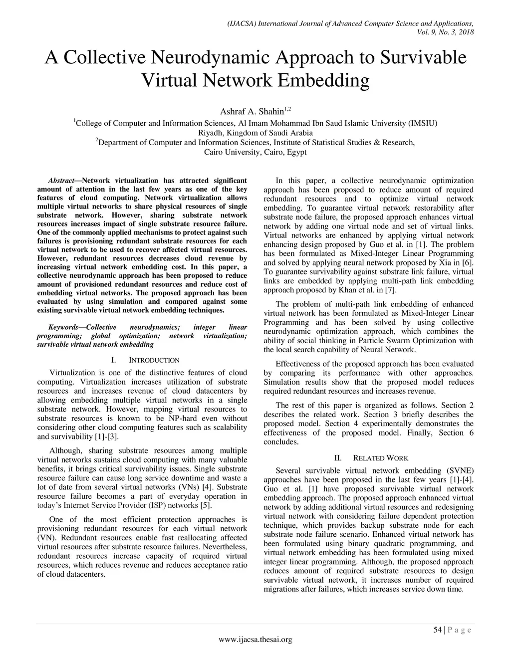 Network virtualization has attracted significant amount of attention in the last few years as one of the key features of cloud computing. Network virtualization allows multiple virtual networks to share physical resources of single substrate network. However, sharing substrate network resources increases impact of single substrate resource failure. One of the commonly applied mechanisms to protect against such failures is provisioning redundant substrate resources for each virtual network to be used to recover affected virtual resources. However, redundant resources decreases cloud revenue by increasing virtual network embedding cost. In this paper, a collective neurodynamic approach has been proposed to reduce amount of provisioned redundant resources and reduce cost of embedding virtual networks. The proposed approach has been evaluated by using simulation and compared against some existing survivable virtual network embedding techniques.