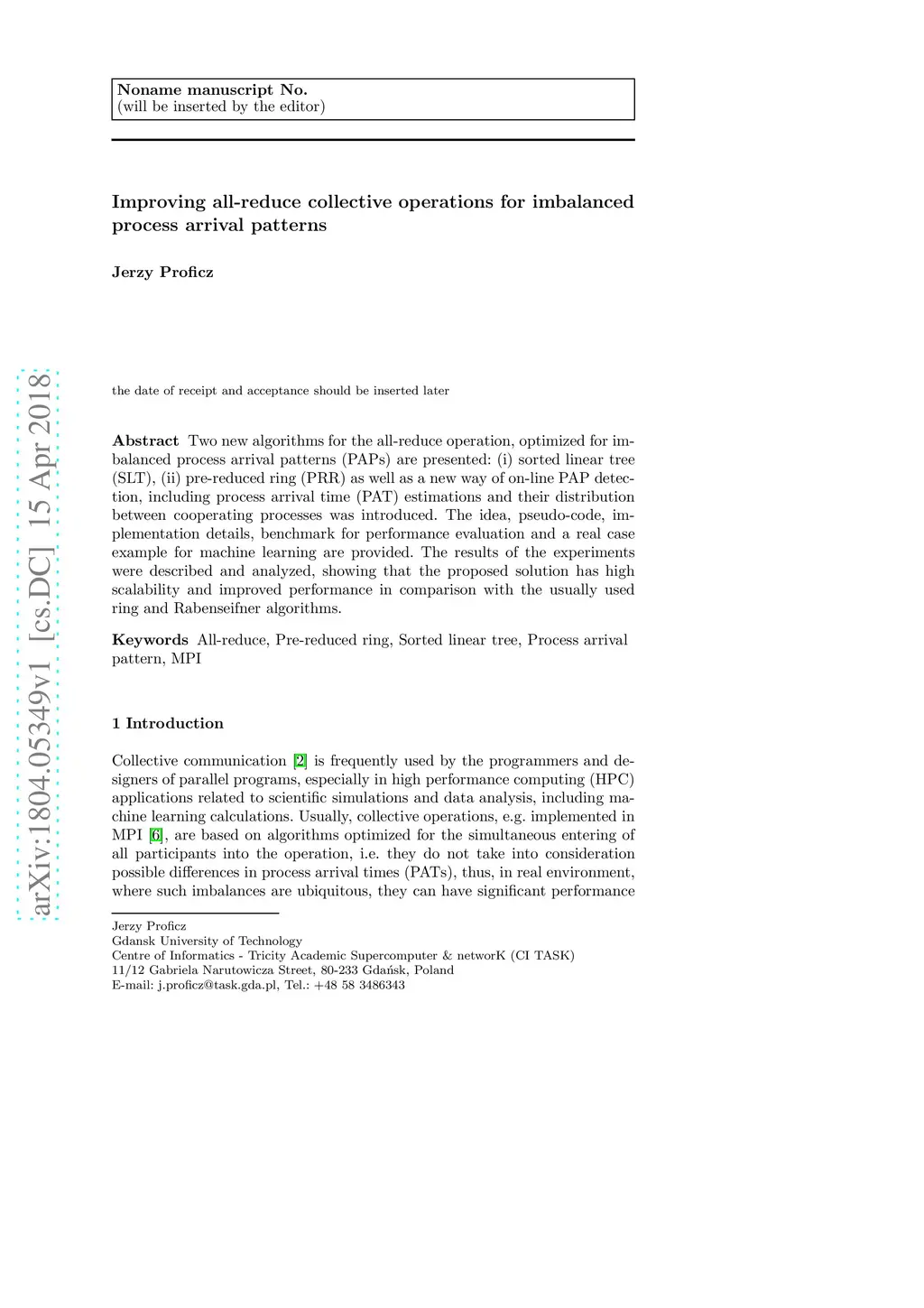 Two new algorithms for the all-reduce operation, optimized for imbalanced process arrival patterns (PAPs) are presented: (i) sorted linear tree (SLT), (ii) pre-reduced ring (PRR) as well as a new way of on-line PAP detection, including process arrival time (PAT) estimations and their distribution between cooperating processes was introduced. The idea, pseudo-code, implementation details, benchmark for performance evaluation and a real case example for machine learning are provided. The results of the experiments were described and analyzed, showing that the proposed solution has high scalability and improved performance in comparison with the usually used ring and Rabenseifner algorithms.