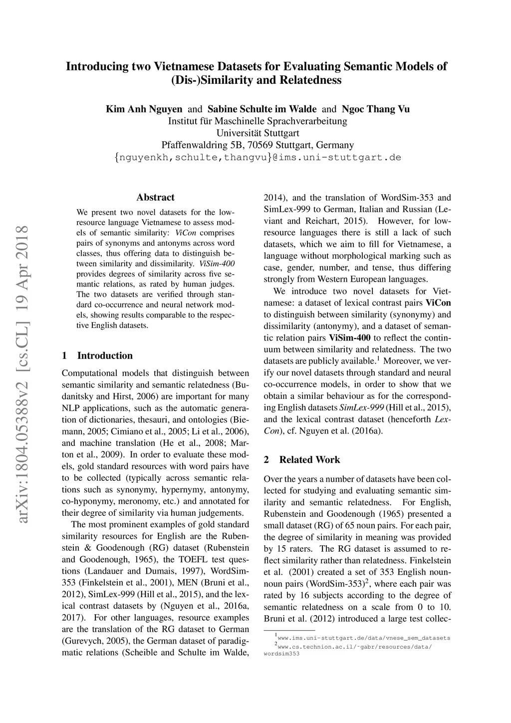 We present two novel datasets for the low-resource language Vietnamese to assess models of semantic similarity: ViCon comprises pairs of synonyms and antonyms across word classes, thus offering data to distinguish between similarity and dissimilarity. ViSim-400 provides degrees of similarity across five semantic relations, as rated by human judges. The two datasets are verified through standard co-occurrence and neural network models, showing results comparable to the respective English datasets.