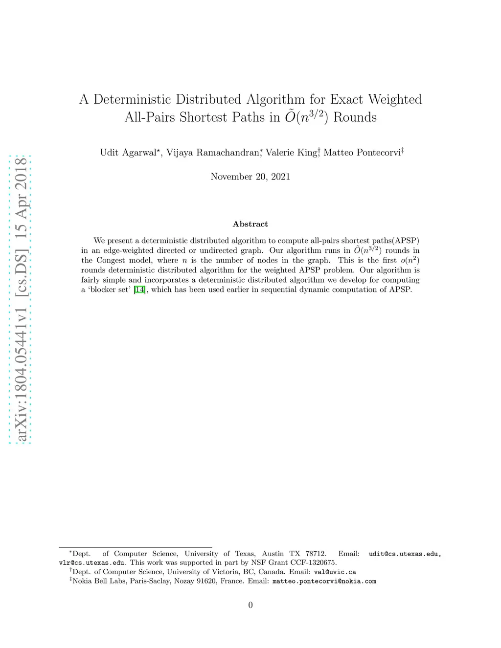 We present a deterministic distributed algorithm to compute all-pairs shortest paths(APSP) in an edge-weighted directed or undirected graph. Our algorithm runs in rounds in the Congest model, where is the number of nodes in the graph. This is the first rounds deterministic distributed algorithm for the weighted APSP problem. Our algorithm is fairly simple and incorporates a deterministic distributed algorithm we develop for computing a `blocker set' \cite{King99}, which has been used earlier in sequential dynamic computation of APSP.