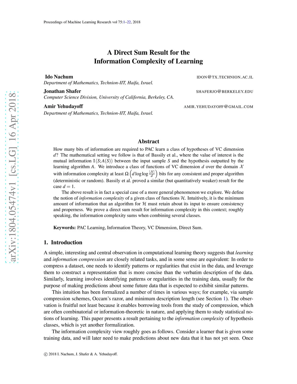 How many bits of information are required to PAC learn a class of hypotheses of VC dimension ? The mathematical setting we follow is that of Bassily et al. (2018), where the value of interest is the mutual information between the input sample and the hypothesis outputted by the learning algorithm . We introduce a class of functions of VC dimension over the domain with information complexity at least bits for any consistent and proper algorithm (deterministic or random). Bassily et al. proved a similar (but quantitatively weaker) result for the case . The above result is in fact a special case of a more general phenomenon we explore. We define the notion of information complexity of a given class of functions . Intuitively, it is the minimum amount of information that an algorithm for must retain about its input to ensure consistency and properness. We prove a direct sum result for information complexity in this context; roughly speaking, the information complexity sums when combining several classes.