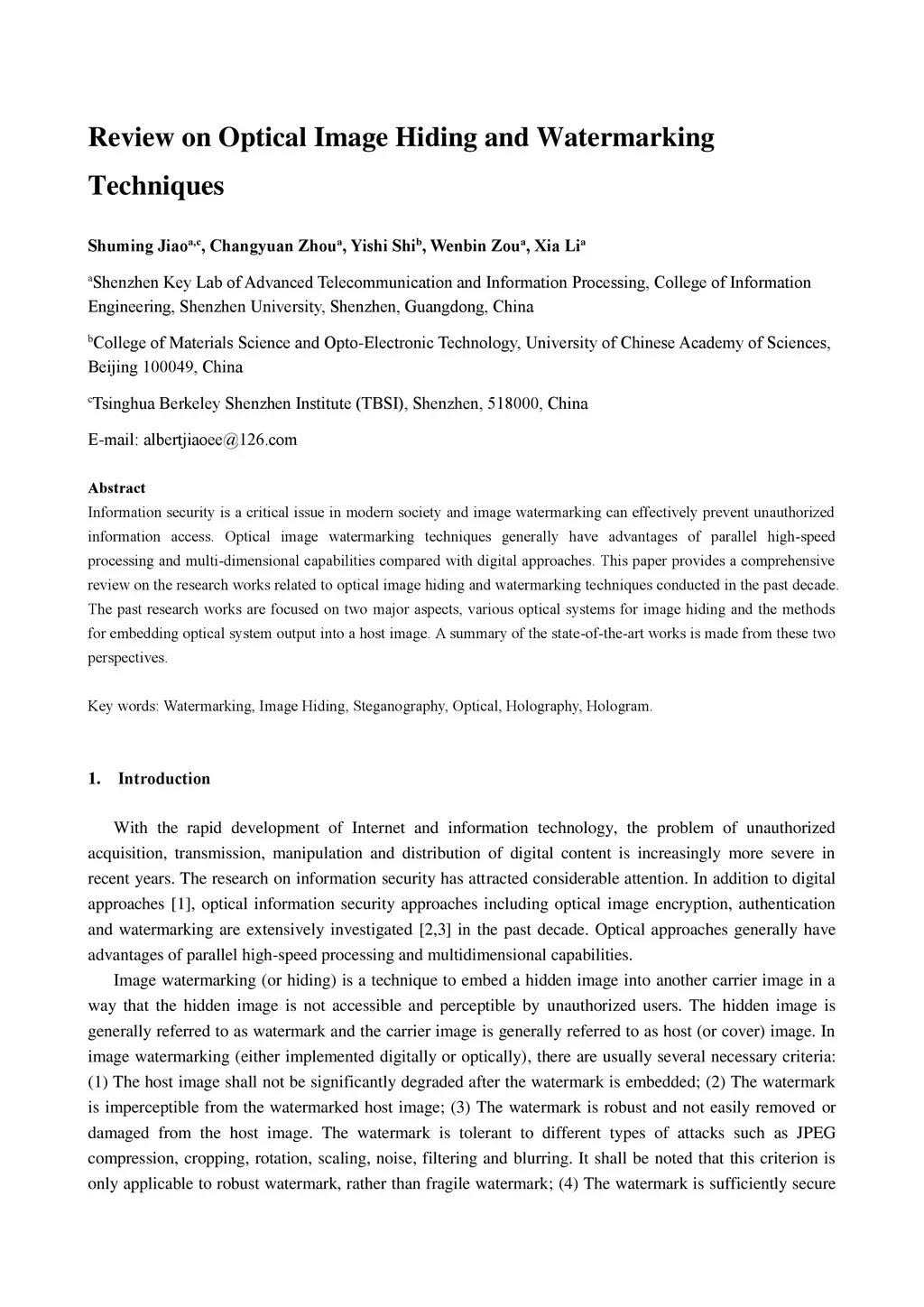 Information security is a critical issue in modern society and image watermarking can effectively prevent unauthorized information access. Optical image watermarking techniques generally have advantages of parallel high-speed processing and multi-dimensional capabilities compared with digital approaches. This paper provides a comprehensive review on the research works related to optical image hiding and watermarking techniques conducted in the past decade. The past research works are focused on two major aspects, various optical systems for image hiding and the methods for embedding optical system output into a host image. A summary of the state-of-the-art works is made from these two perspectives.