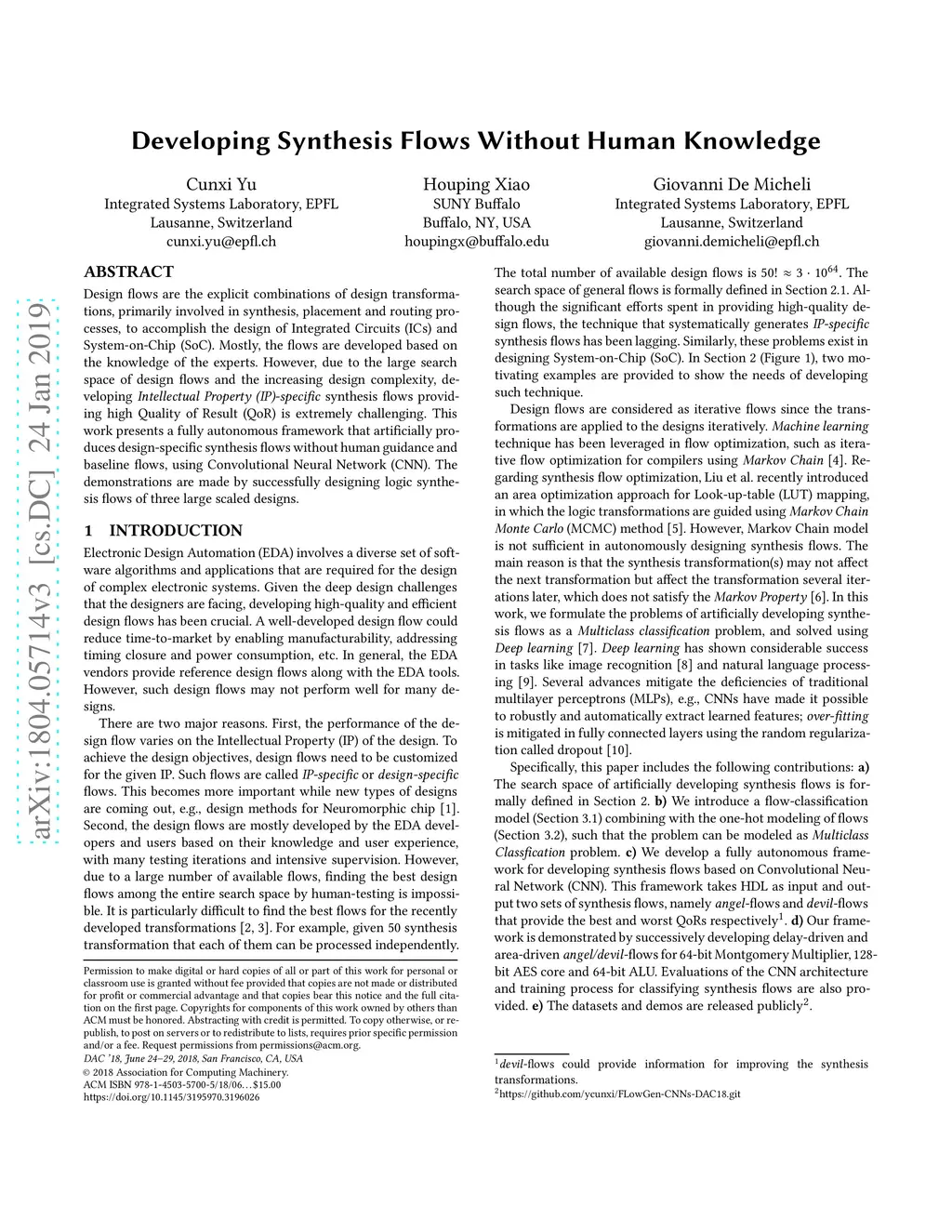 Design flows are the explicit combinations of design transformations, primarily involved in synthesis, placement and routing processes, to accomplish the design of Integrated Circuits (ICs) and System-on-Chip (SoC). Mostly, the flows are developed based on the knowledge of the experts. However, due to the large search space of design flows and the increasing design complexity, developing Intellectual Property (IP)-specific synthesis flows providing high Quality of Result (QoR) is extremely challenging. This work presents a fully autonomous framework that artificially produces design-specific synthesis flows without human guidance and baseline flows, using Convolutional Neural Network (CNN). The demonstrations are made by successfully designing logic synthesis flows of three large scaled designs.