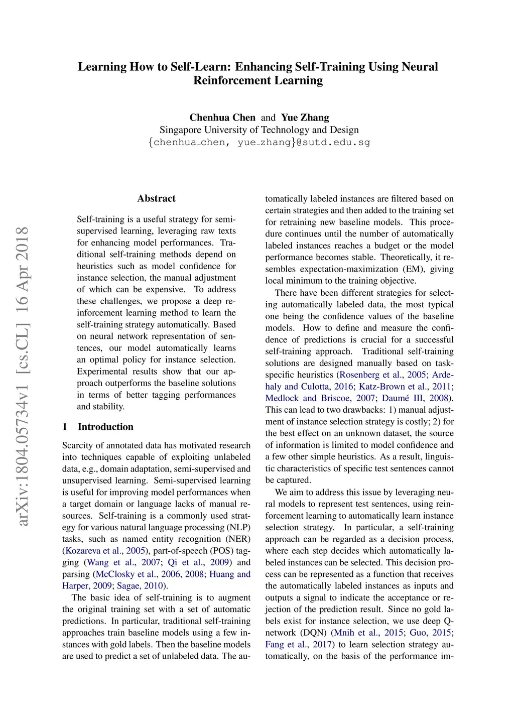 Self-training is a useful strategy for semi-supervised learning, leveraging raw texts for enhancing model performances. Traditional self-training methods depend on heuristics such as model confidence for instance selection, the manual adjustment of which can be expensive. To address these challenges, we propose a deep reinforcement learning method to learn the self-training strategy automatically. Based on neural network representation of sentences, our model automatically learns an optimal policy for instance selection. Experimental results show that our approach outperforms the baseline solutions in terms of better tagging performances and stability.