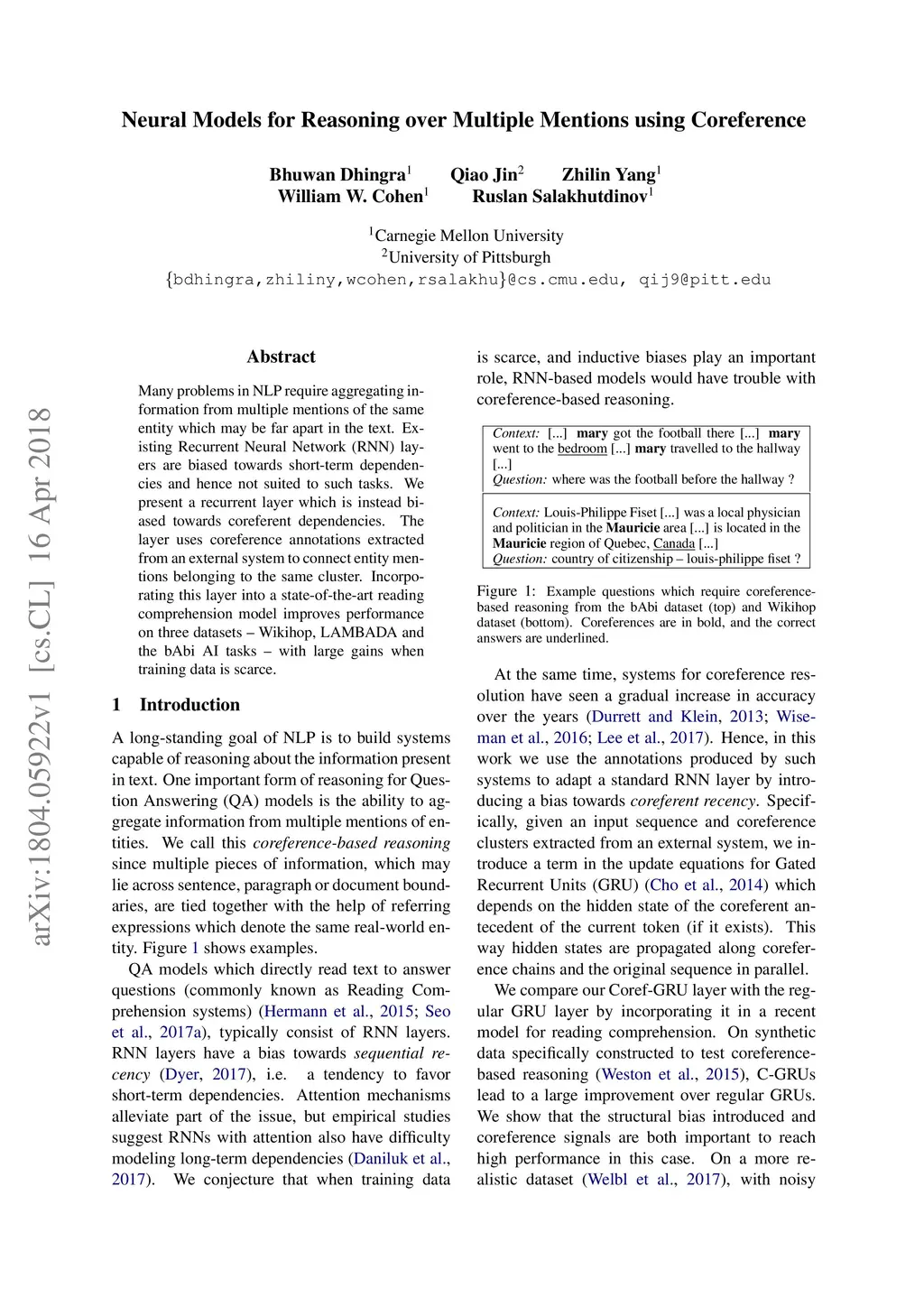 Neural Models for Reasoning over Multiple Mentions using Coreference