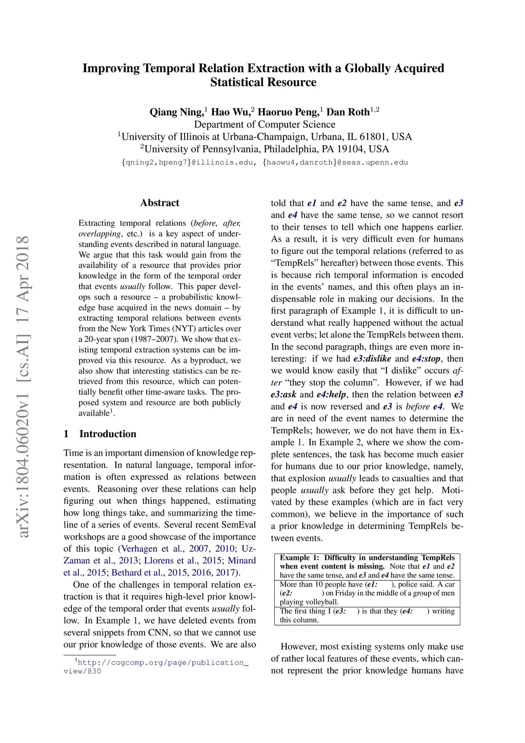 Extracting temporal relations (before, after, overlapping, etc.) is a key aspect of understanding events described in natural language. We argue that this task would gain from the availability of a resource that provides prior knowledge in the form of the temporal order that events usually follow. This paper develops such a resource -- a probabilistic knowledge base acquired in the news domain -- by extracting temporal relations between events from the New York Times (NYT) articles over a 20-year span (1987--2007). We show that existing temporal extraction systems can be improved via this resource. As a byproduct, we also show that interesting statistics can be retrieved from this resource, which can potentially benefit other time-aware tasks. The proposed system and resource are both publicly available.