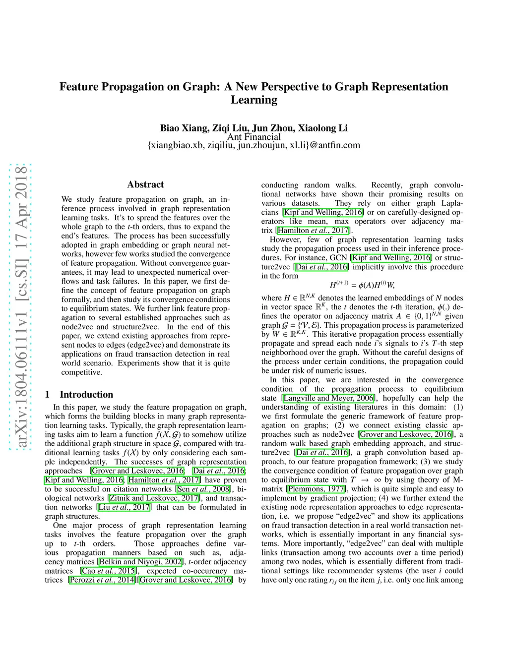 We study feature propagation on graph, an inference process involved in graph representation learning tasks. It's to spread the features over the whole graph to the -th orders, thus to expand the end's features. The process has been successfully adopted in graph embedding or graph neural networks, however few works studied the convergence of feature propagation. Without convergence guarantees, it may lead to unexpected numerical overflows and task failures. In this paper, we first define the concept of feature propagation on graph formally, and then study its convergence conditions to equilibrium states. We further link feature propagation to several established approaches such as node2vec and structure2vec. In the end of this paper, we extend existing approaches from represent nodes to edges (edge2vec) and demonstrate its applications on fraud transaction detection in real world scenario. Experiments show that it is quite competitive.