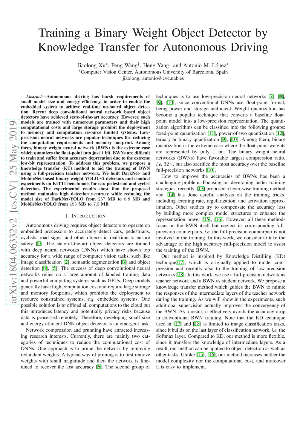 Autonomous driving has harsh requirements of small model size and energy efficiency, in order to enable the embedded system to achieve real-time on-board object detection. Recent deep convolutional neural network based object detectors have achieved state-of-the-art accuracy. However, such models are trained with numerous parameters and their high computational costs and large storage prohibit the deployment to memory and computation resource limited systems. Low-precision neural networks are popular techniques for reducing the computation requirements and memory footprint. Among them, binary weight neural network (BWN) is the extreme case which quantizes the float-point into just bit. BWNs are difficult to train and suffer from accuracy deprecation due to the extreme low-bit representation. To address this problem, we propose a knowledge transfer (KT) method to aid the training of BWN using a full-precision teacher network. We built DarkNet- and MobileNet-based binary weight YOLO-v2 detectors and conduct experiments on KITTI benchmark for car, pedestrian and cyclist detection. The experimental results show that the proposed method maintains high detection accuracy while reducing the model size of DarkNet-YOLO from 257 MB to 8.8 MB and MobileNet-YOLO from 193 MB to 7.9 MB.