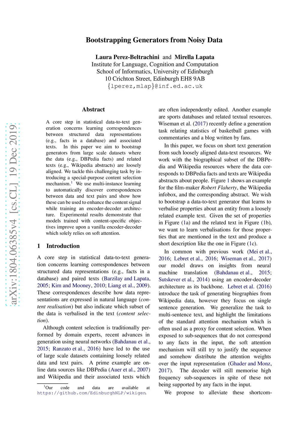 A core step in statistical data-to-text generation concerns learning correspondences between structured data representations (e.g., facts in a database) and associated texts. In this paper we aim to bootstrap generators from large scale datasets where the data (e.g., DBPedia facts) and related texts (e.g., Wikipedia abstracts) are loosely aligned. We tackle this challenging task by introducing a special-purpose content selection mechanism. We use multi-instance learning to automatically discover correspondences between data and text pairs and show how these can be used to enhance the content signal while training an encoder-decoder architecture. Experimental results demonstrate that models trained with content-specific objectives improve upon a vanilla encoder-decoder which solely relies on soft attention.