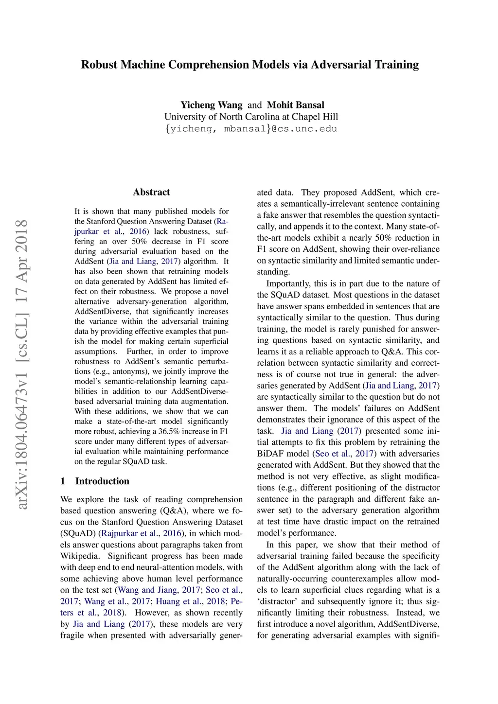 Robust Machine Comprehension Models via Adversarial Training