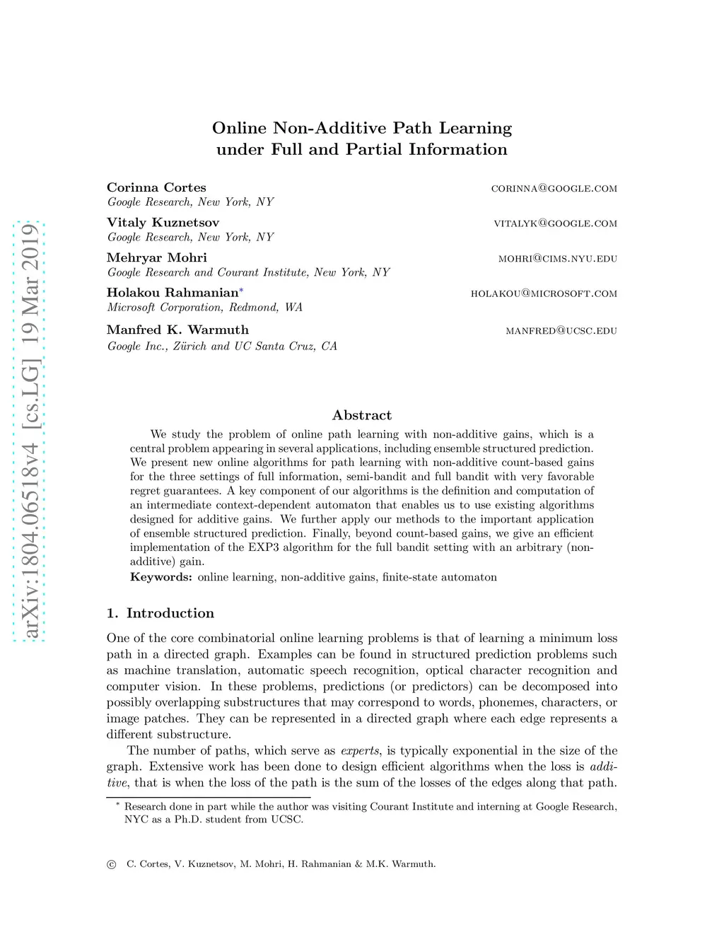We consider the online path learning problem in a graph with non-additive gains/losses. Various settings of full information, semi-bandit, and full bandit are explored. We give an efficient implementation of EXP3 algorithm for the full bandit setting with any (non-additive) gain. Then, focusing on the large family of non-additive count-based gains, we construct an intermediate graph which has equivalent gains that are additive. By operating on this intermediate graph, we are able to use algorithms like Component Hedge and ComBand for the first time for non-additive gains. Finally, we apply our methods to the important application of ensemble structured prediction.