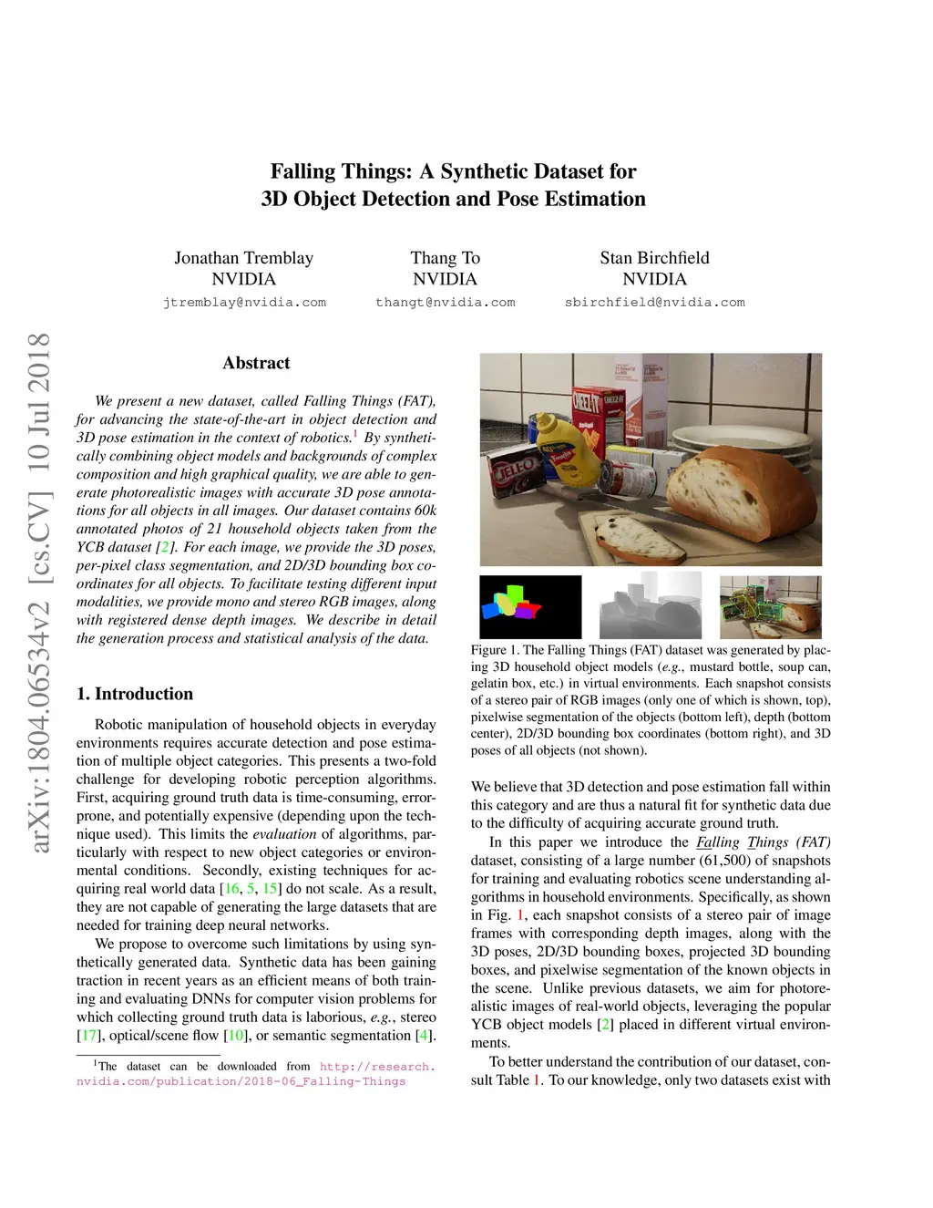 Falling Things: A Synthetic Dataset for 3D Object Detection and Pose