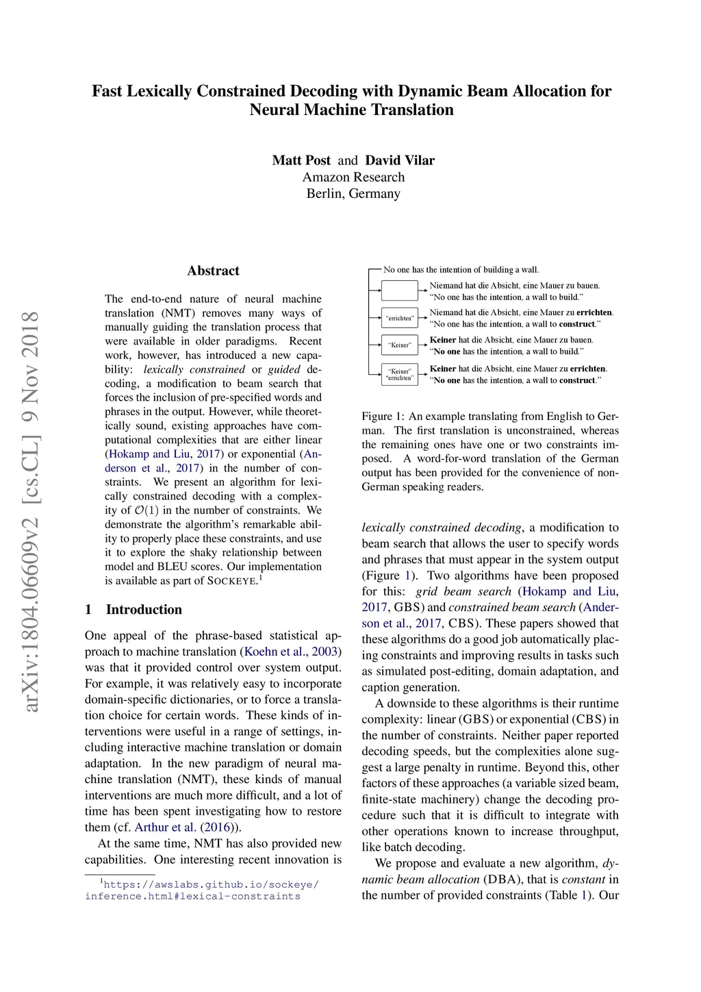 The end-to-end nature of neural machine translation (NMT) removes many ways of manually guiding the translation process that were available in older paradigms. Recent work, however, has introduced a new capability: lexically constrained or guided decoding, a modification to beam search that forces the inclusion of pre-specified words and phrases in the output. However, while theoretically sound, existing approaches have computational complexities that are either linear (Hokamp and Liu, 2017) or exponential (Anderson et al., 2017) in the number of constraints. We present a algorithm for lexically constrained decoding with a complexity of O(1) in the number of constraints. We demonstrate the algorithms remarkable ability to properly place these constraints, and use it to explore the shaky relationship between model and BLEU scores. Our implementation is available as part of Sockeye.