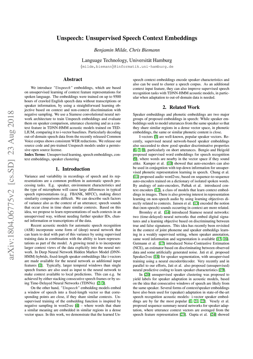 We introduce "Unspeech" embeddings, which are based on unsupervised learning of context feature representations for spoken language. The embeddings were trained on up to 9500 hours of crawled English speech data without transcriptions or speaker information, by using a straightforward learning objective based on context and non-context discrimination with negative sampling. We use a Siamese convolutional neural network architecture to train Unspeech embeddings and evaluate them on speaker comparison, utterance clustering and as a context feature in TDNN-HMM acoustic models trained on TED-LIUM, comparing it to i-vector baselines. Particularly decoding out-of-domain speech data from the recently released Common Voice corpus shows consistent WER reductions. We release our source code and pre-trained Unspeech models under a permissive open source license.
