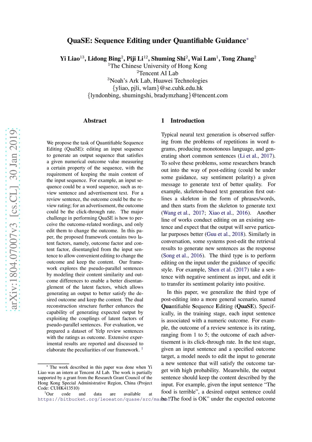 We propose the task of Quantifiable Sequence Editing (QuaSE): editing an input sequence to generate an output sequence that satisfies a given numerical outcome value measuring a certain property of the sequence, with the requirement of keeping the main content of the input sequence. For example, an input sequence could be a word sequence, such as review sentence and advertisement text. For a review sentence, the outcome could be the review rating; for an advertisement, the outcome could be the click-through rate. The major challenge in performing QuaSE is how to perceive the outcome-related wordings, and only edit them to change the outcome. In this paper, the proposed framework contains two latent factors, namely, outcome factor and content factor, disentangled from the input sentence to allow convenient editing to change the outcome and keep the content. Our framework explores the pseudo-parallel sentences by modeling their content similarity and outcome differences to enable a better disentanglement of the latent factors, which allows generating an output to better satisfy the desired outcome and keep the content. The dual reconstruction structure further enhances the capability of generating expected output by exploiting the couplings of latent factors of pseudo-parallel sentences. For evaluation, we prepared a dataset of Yelp review sentences with the ratings as outcome. Extensive experimental results are reported and discussed to elaborate the peculiarities of our framework.