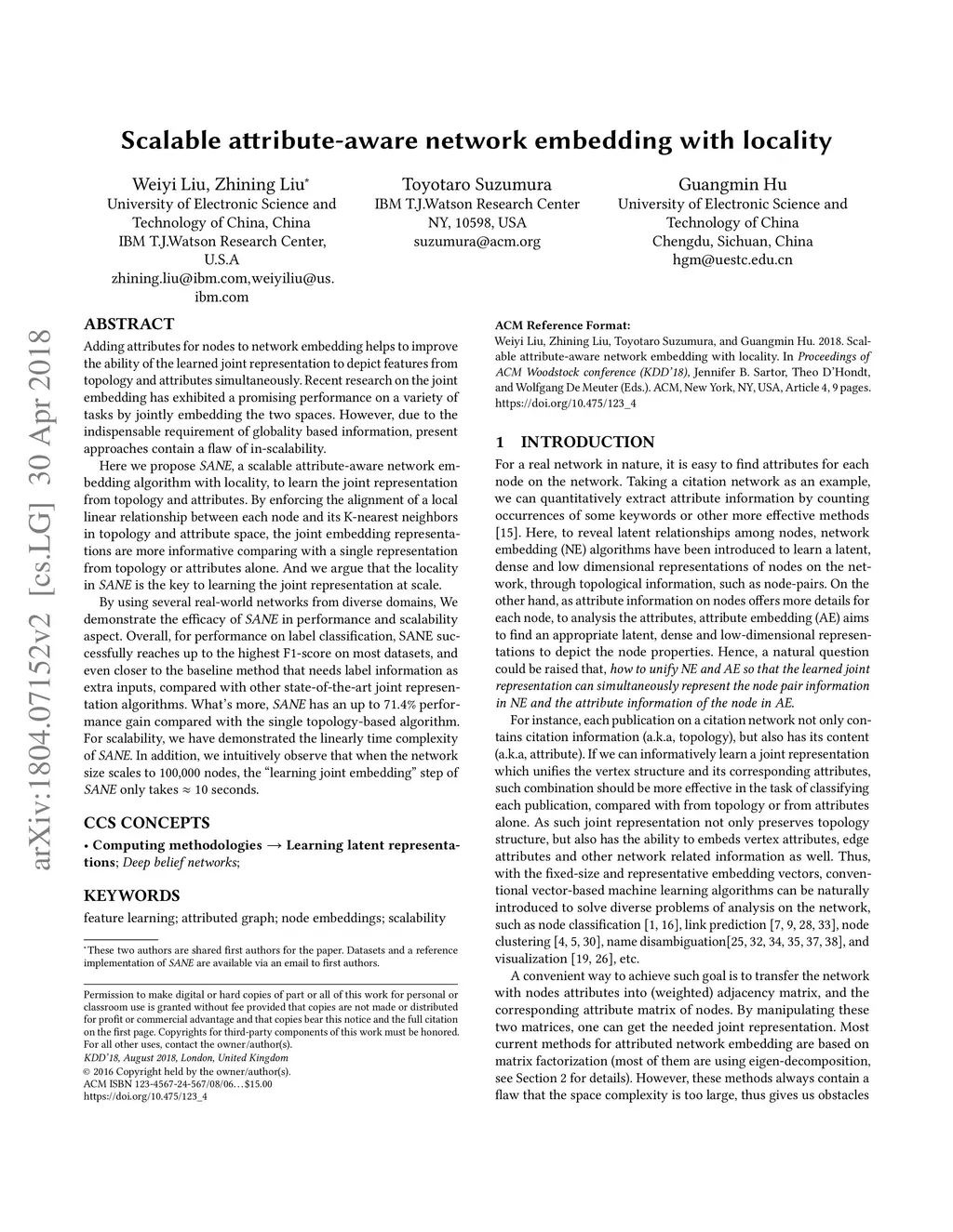 Adding attributes for nodes to network embedding helps to improve the ability of the learned joint representation to depict features from topology and attributes simultaneously. Recent research on the joint embedding has exhibited a promising performance on a variety of tasks by jointly embedding the two spaces. However, due to the indispensable requirement of globality based information, present approaches contain a flaw of in-scalability. Here we propose \emph{SANE}, a scalable attribute-aware network embedding algorithm with locality, to learn the joint representation from topology and attributes. By enforcing the alignment of a local linear relationship between each node and its K-nearest neighbors in topology and attribute space, the joint embedding representations are more informative comparing with a single representation from topology or attributes alone. And we argue that the locality in \emph{SANE} is the key to learning the joint representation at scale. By using several real-world networks from diverse domains, We demonstrate the efficacy of \emph{SANE} in performance and scalability aspect. Overall, for performance on label classification, SANE successfully reaches up to the highest F1-score on most datasets, and even closer to the baseline method that needs label information as extra inputs, compared with other state-of-the-art joint representation algorithms. What's more, \emph{SANE} has an up to 71.4\% performance gain compared with the single topology-based algorithm. For scalability, we have demonstrated the linearly time complexity of \emph{SANE}. In addition, we intuitively observe that when the network size scales to 100,000 nodes, the "learning joint embedding" step of \emph{SANE} only takes seconds.