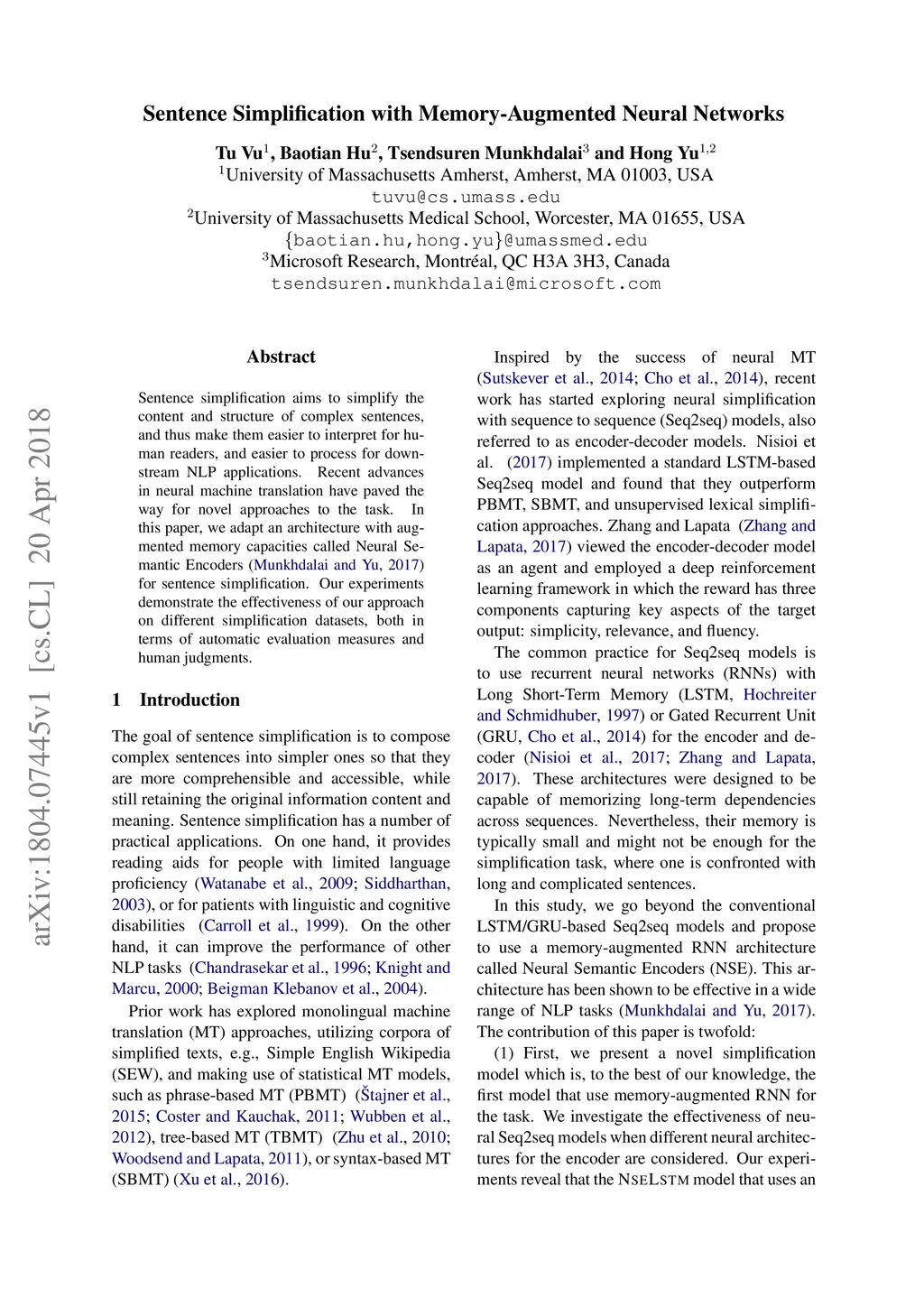 Sentence simplification aims to simplify the content and structure of complex sentences, and thus make them easier to interpret for human readers, and easier to process for downstream NLP applications. Recent advances in neural machine translation have paved the way for novel approaches to the task. In this paper, we adapt an architecture with augmented memory capacities called Neural Semantic Encoders (Munkhdalai and Yu, 2017) for sentence simplification. Our experiments demonstrate the effectiveness of our approach on different simplification datasets, both in terms of automatic evaluation measures and human judgments.