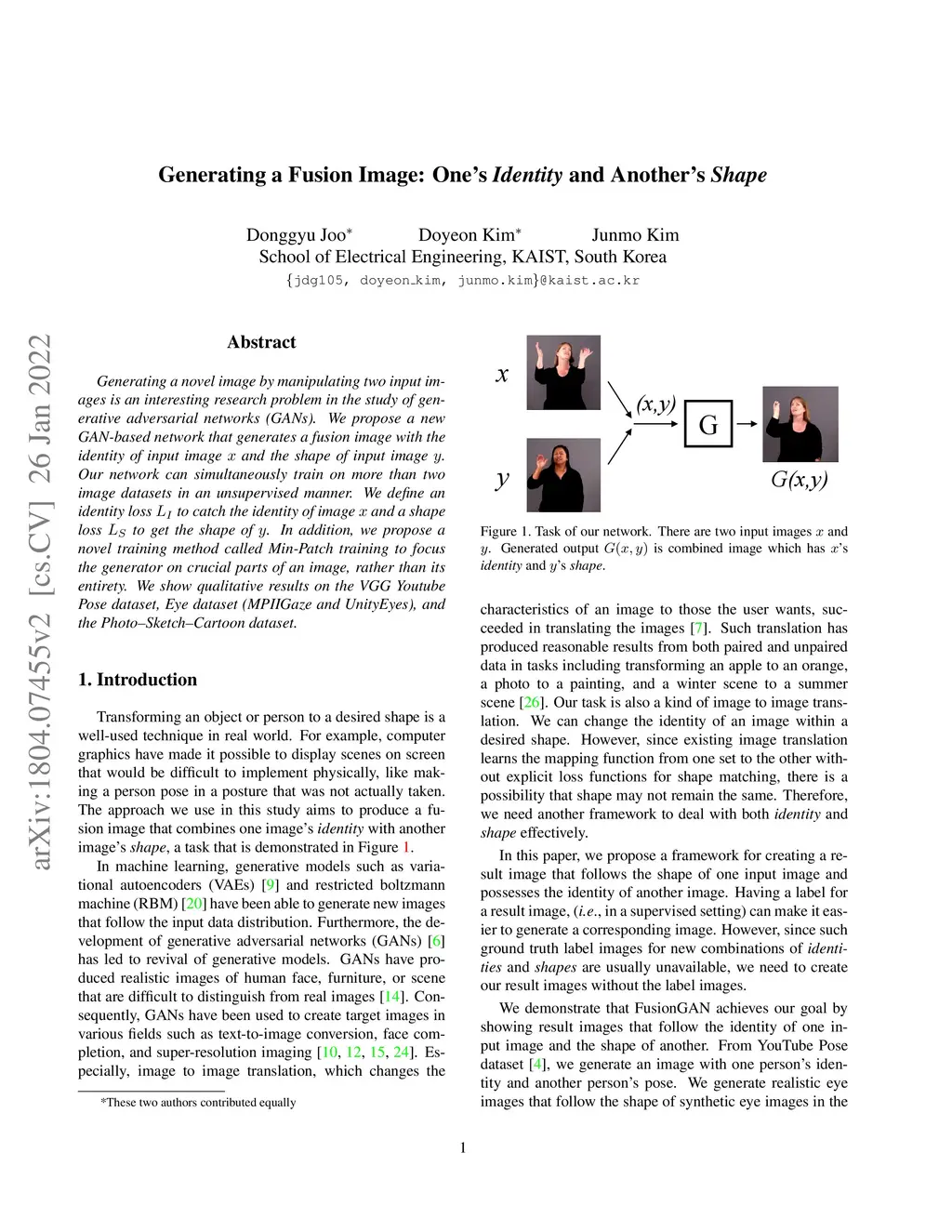 Generating a novel image by manipulating two input images is an interesting research problem in the study of generative adversarial networks (GANs). We propose a new GAN-based network that generates a fusion image with the identity of input image x and the shape of input image y. Our network can simultaneously train on more than two image datasets in an unsupervised manner. We define an identity loss LI to catch the identity of image x and a shape loss LS to get the shape of y. In addition, we propose a novel training method called Min-Patch training to focus the generator on crucial parts of an image, rather than its entirety. We show qualitative results on the VGG Youtube Pose dataset, Eye dataset (MPIIGaze and UnityEyes), and the Photo-Sketch-Cartoon dataset.