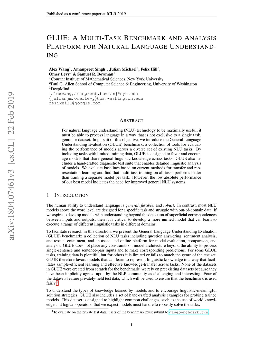 For natural language understanding (NLU) technology to be maximally useful, both practically and as a scientific object of study, it must be general: it must be able to process language in a way that is not exclusively tailored to any one specific task or dataset. In pursuit of this objective, we introduce the General Language Understanding Evaluation benchmark (GLUE), a tool for evaluating and analyzing the performance of models across a diverse range of existing NLU tasks. GLUE is model-agnostic, but it incentivizes sharing knowledge across tasks because certain tasks have very limited training data. We further provide a hand-crafted diagnostic test suite that enables detailed linguistic analysis of NLU models. We evaluate baselines based on current methods for multi-task and transfer learning and find that they do not immediately give substantial improvements over the aggregate performance of training a separate model per task, indicating room for improvement in developing general and robust NLU systems.