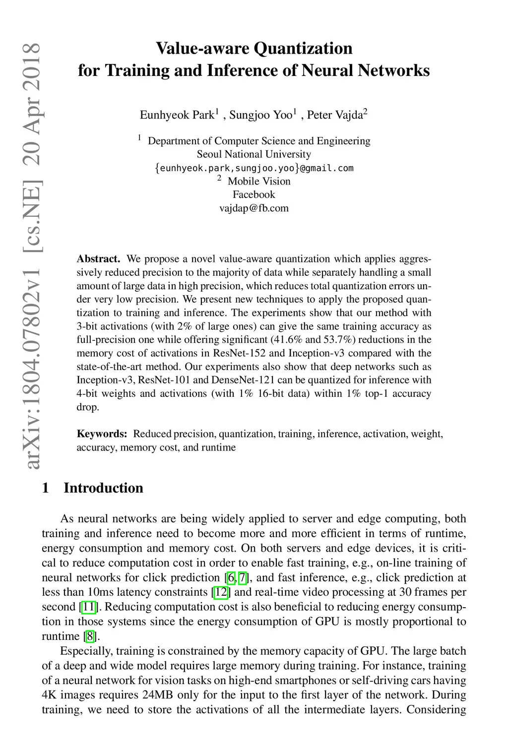 We propose a novel value-aware quantization which applies aggressively reduced precision to the majority of data while separately handling a small amount of large data in high precision, which reduces total quantization errors under very low precision. We present new techniques to apply the proposed quantization to training and inference. The experiments show that our method with 3-bit activations (with 2% of large ones) can give the same training accuracy as full-precision one while offering significant (41.6% and 53.7%) reductions in the memory cost of activations in ResNet-152 and Inception-v3 compared with the state-of-the-art method. Our experiments also show that deep networks such as Inception-v3, ResNet-101 and DenseNet-121 can be quantized for inference with 4-bit weights and activations (with 1% 16-bit data) within 1% top-1 accuracy drop.